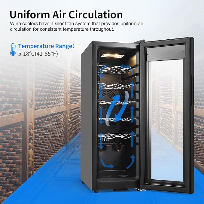 - 12 Bottles Capacity: The wine fridge can store 12 standard wine bottles; The wine cooler has 5 removable shelves that are easy to access and organize your wine