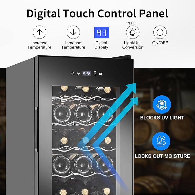 - 18 Bottles Capacity: The wine fridge can store 18 standard wine bottles; The wine cooler has 5 removable shelves that are easy to access and organize your wine