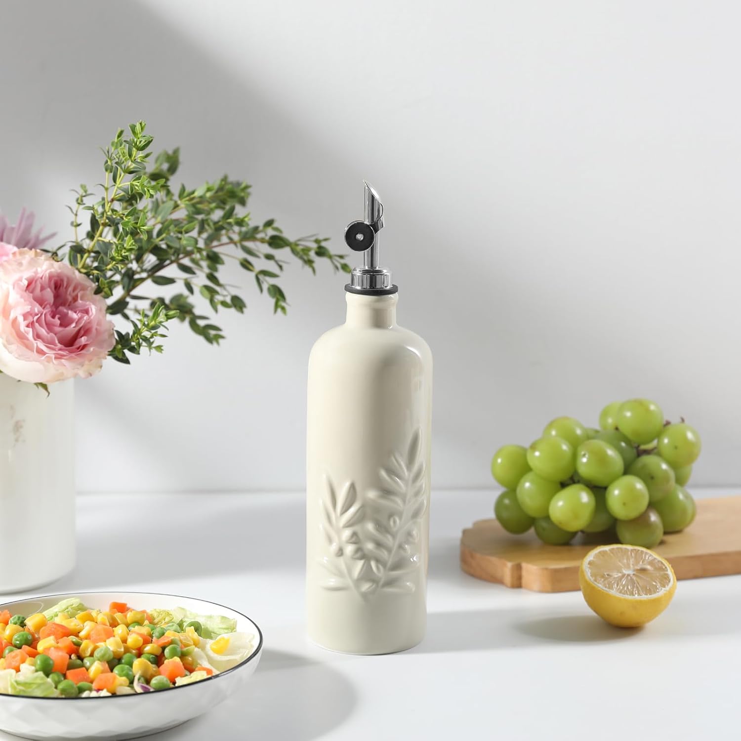 Sweejar 18 Oz Oil Dispenser for Kitchen with Gravity Spout, Ceramic Olive Oil Dispenser Bottle, Relief Opaque Vinegar Container for Evoo, Vinegar, Soy Sauce, Pack of 1(Beige, Silver Spout)