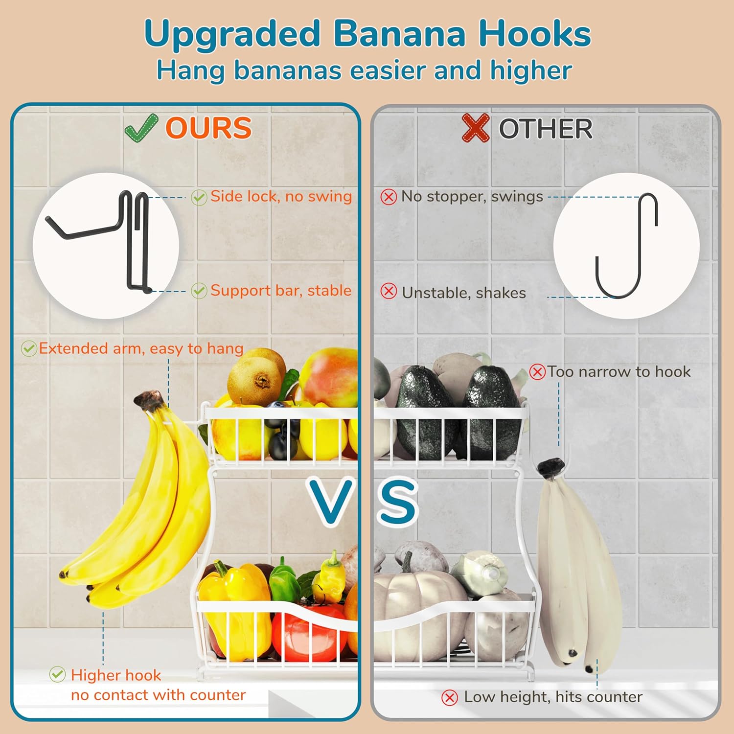 Large 2-Tier Fruit Basket for Kitchen Counter with 2 Banana Hangers – Metal Fruit Bowl for Onion, Vegetable, Snacks, Breads Storage – Countertop Organizer – White