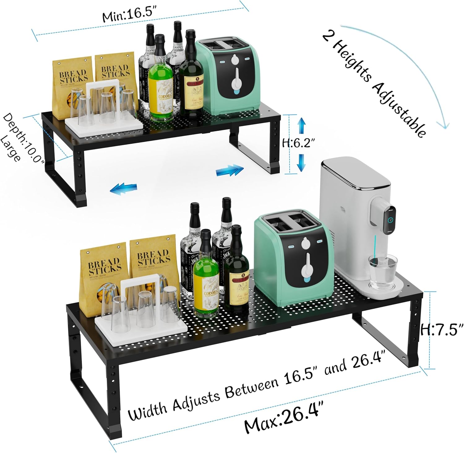 - ✅【Adjustable & Expandable Cabinet Shelf Organizer】 Customize your kitchen storage with our expandable metal shelving unit! Easily adjust the length from 16.5" to 26.4" to fit cabinets, countertops, or pantry spaces (dimensions: 16.5~26.4"W x 10.0"D x 6.2~7.5"H). Stack multiple units vertically to create a tiered storage solution for maximum space efficiency—perfect for plates, bowls, mugs, or canned goods.