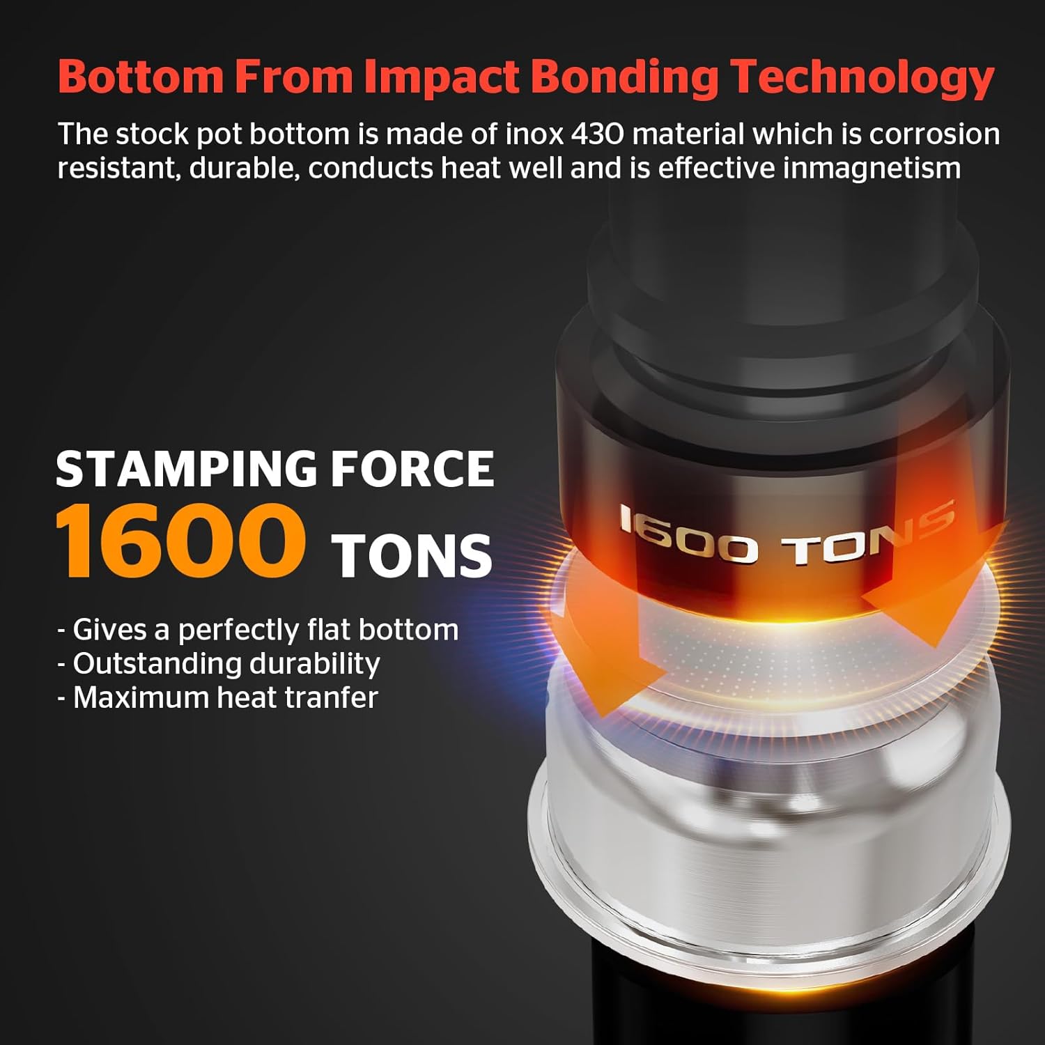 - [EXCELLENT HEAT CONDUCTION & RETENTION] - Features an impact-bonded aluminum base for fast and even heat distribution. The thick, multi-layer bottom prevents scorching and hot spots. The magnetized stainless steel exterior ensures compatibility with induction, gas, electric, glass, ceramic, and halogen cooktops. Taller sides help retain heat longer.