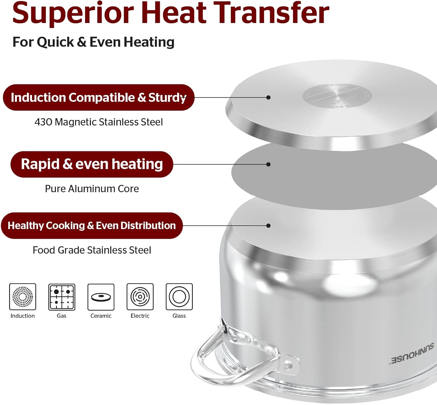 - [Tri-Ply Stainless Steel for Fast Heating] – The 3-ply bonded construction, which alternates layers of stainless steel and aluminum, ensures even heat distribution, preventing hot spots and promoting faster cooking. This design helps save both time and energy.