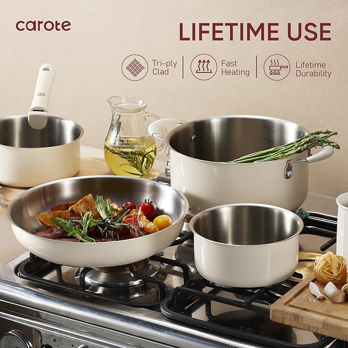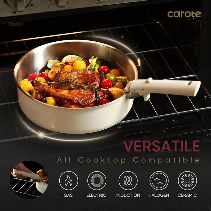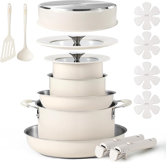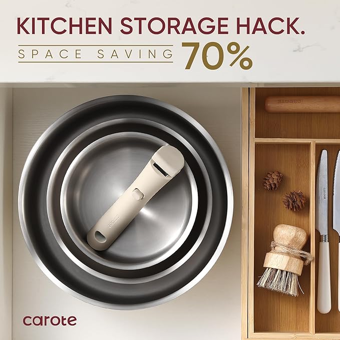 - Optimal storage and easy stacking with the handles off saves up to 70% more space of Carote detachable handle pots and pans set, keeping your kitchen neat and organized.