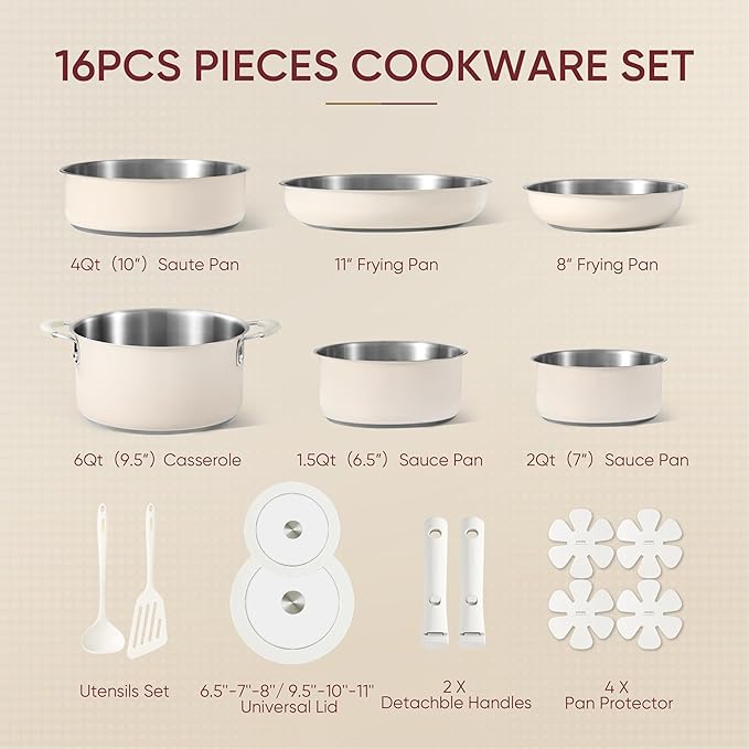 CAROTE 16Pcs Stainless Steel Cookware Set With Detachable/Removeble Handle Set, Space Saving Pots and Pans Set, RV Camping Set, Outer Ceramic Layer Nonstick, Dishwasher/Oven Safe, Kitchen Cooking Set