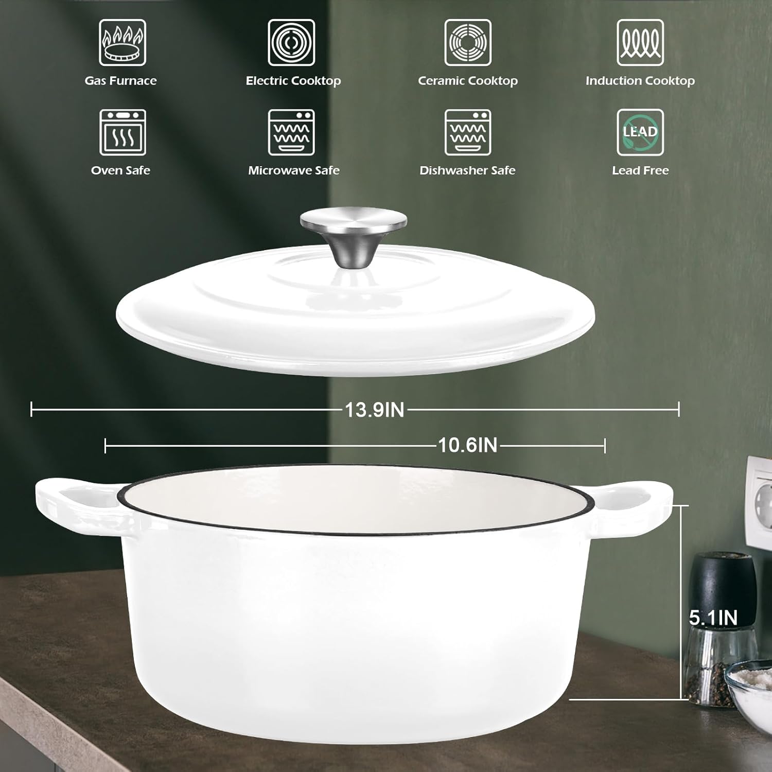 6 Quart Dutch Oven with Lid, Leonyo 6QT Enameled Cast Iron Dutch Oven for Sourdough Bread Baking, Heavy Duty Cookware for Braising, Stews, Roasting, White