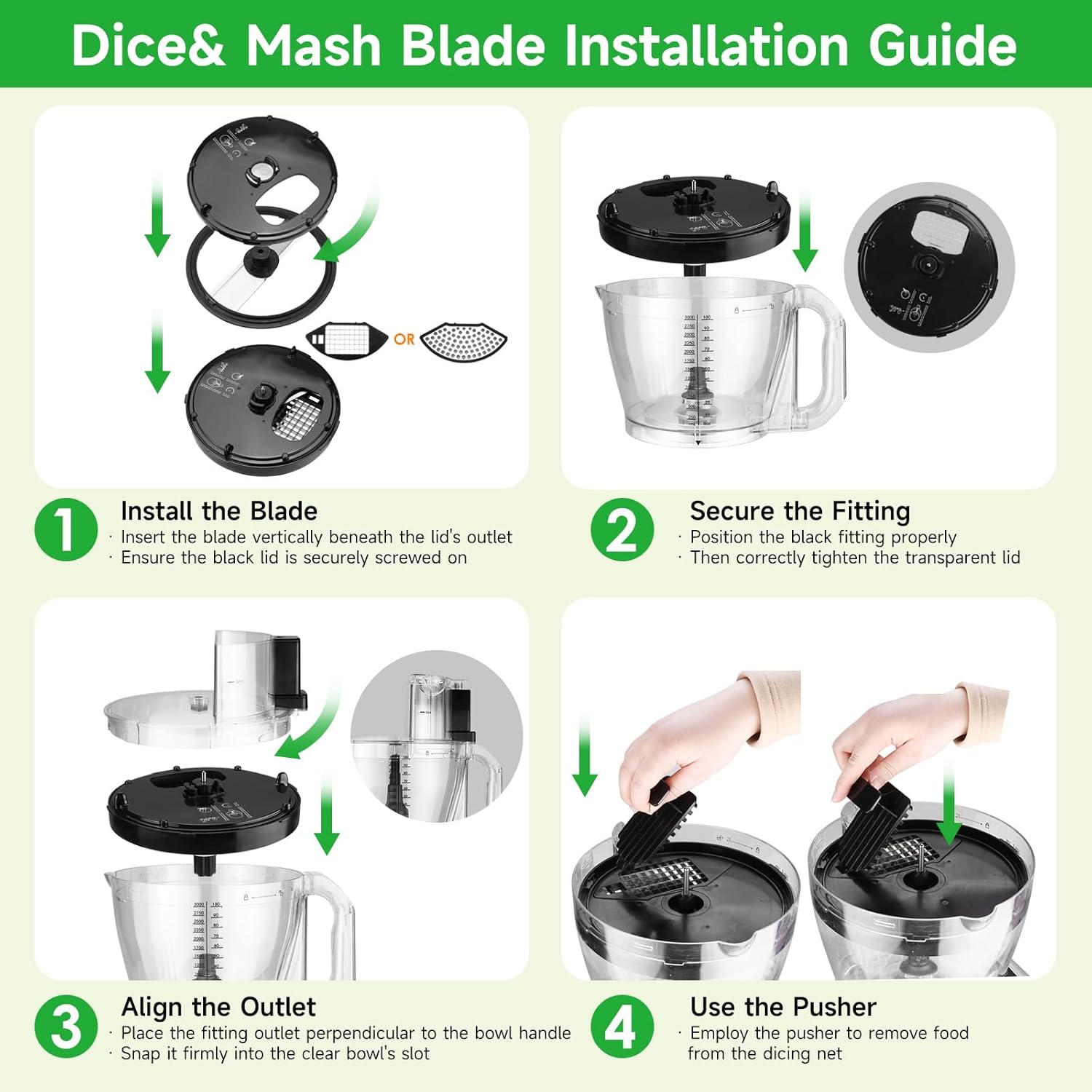 - ⚙️ 【Pro-Grade Blades & Accessories – Ready for Anything!】 Includes 8 durable blades (French fried potato shred disc, reversible rough and fine slicer& julienne discs, shredder disc, cube cutter, masher blade, a S blade and a dough blade) to tackle any recipe. Dice onions, mash potatoes, or blend creamy hummus—all with quick-swap attachments in this multifunctional food processor!