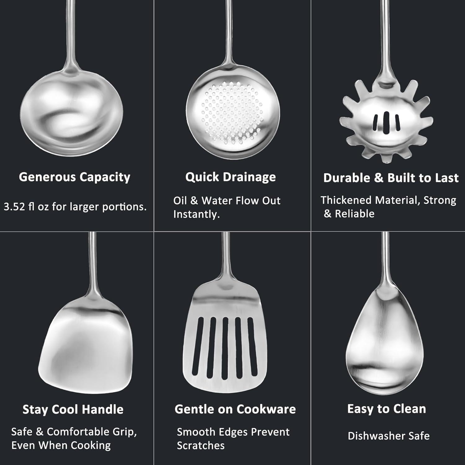 - 【9 pieces Professional Kitchen Utensil Set】1 Serve Solid Spoon, 1 Wok Spatula, 1 Slotted Spatula, 1 Slotted Spoon Skimmer, 1 Soup Ladle, 1 Spaghetti Pasta Spoon, 1 Serving Spoon, 1 Slotted Spoon, 1 Meat Fork, total 9 pieces set.