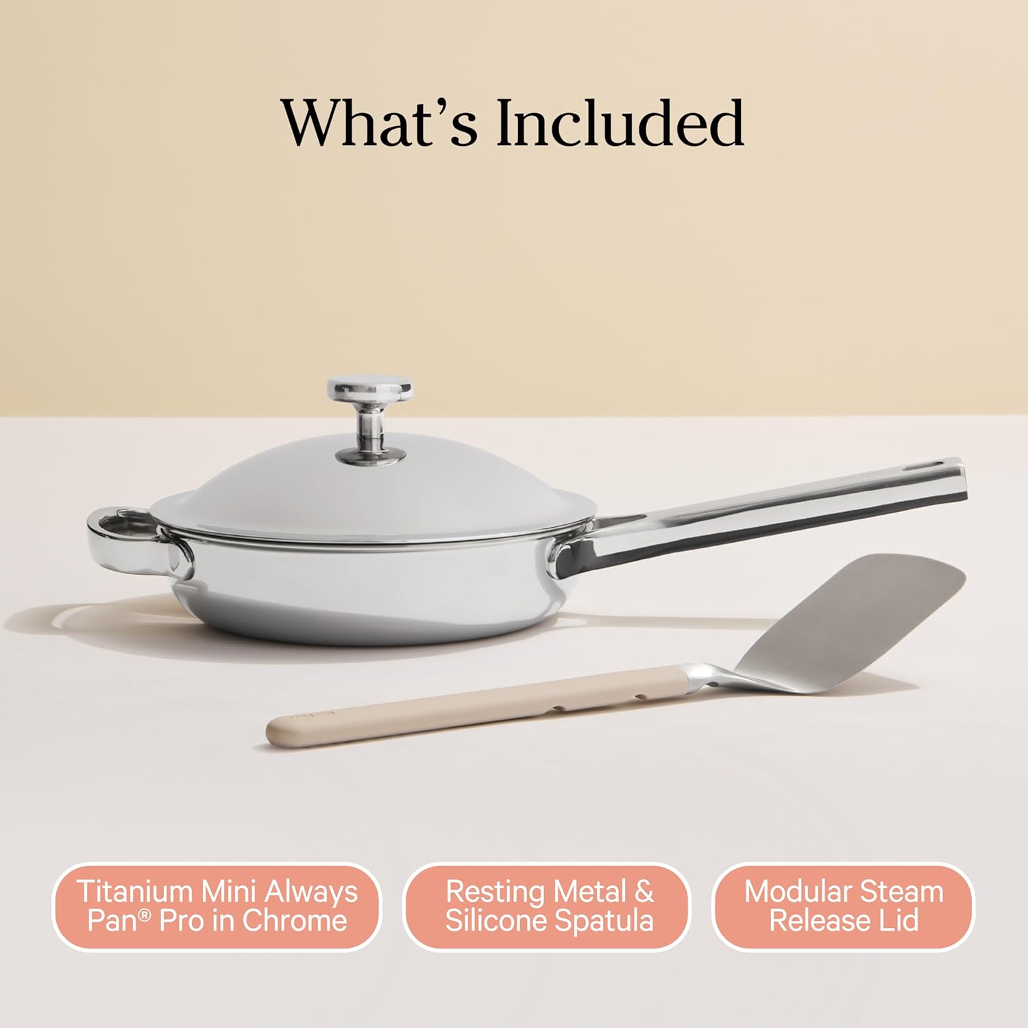Our Place Titanium Mini Always Pan Pro - 8.5” (1.48 Qt) No-Coating Nonstick Skillet | Tri-Ply Titanium & Stainless Steel | Safe for Oven, Induction & Cooktops up to 1000°F | Includes Spatula | Chrome