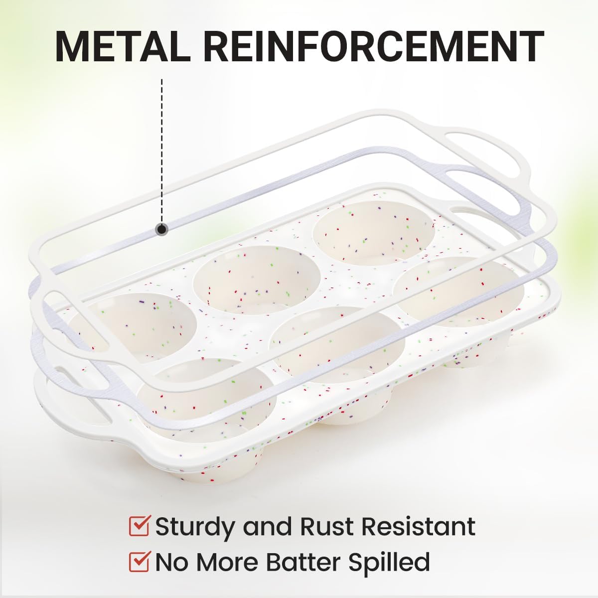 - Metal Structure Silicone Muffin Pan: The hidden stainless steel frame around the outer edge makes muffin pan more sturdy and resistant to deformation. No more spilling after batter fill in with when transfer cupcake pans from counter to oven