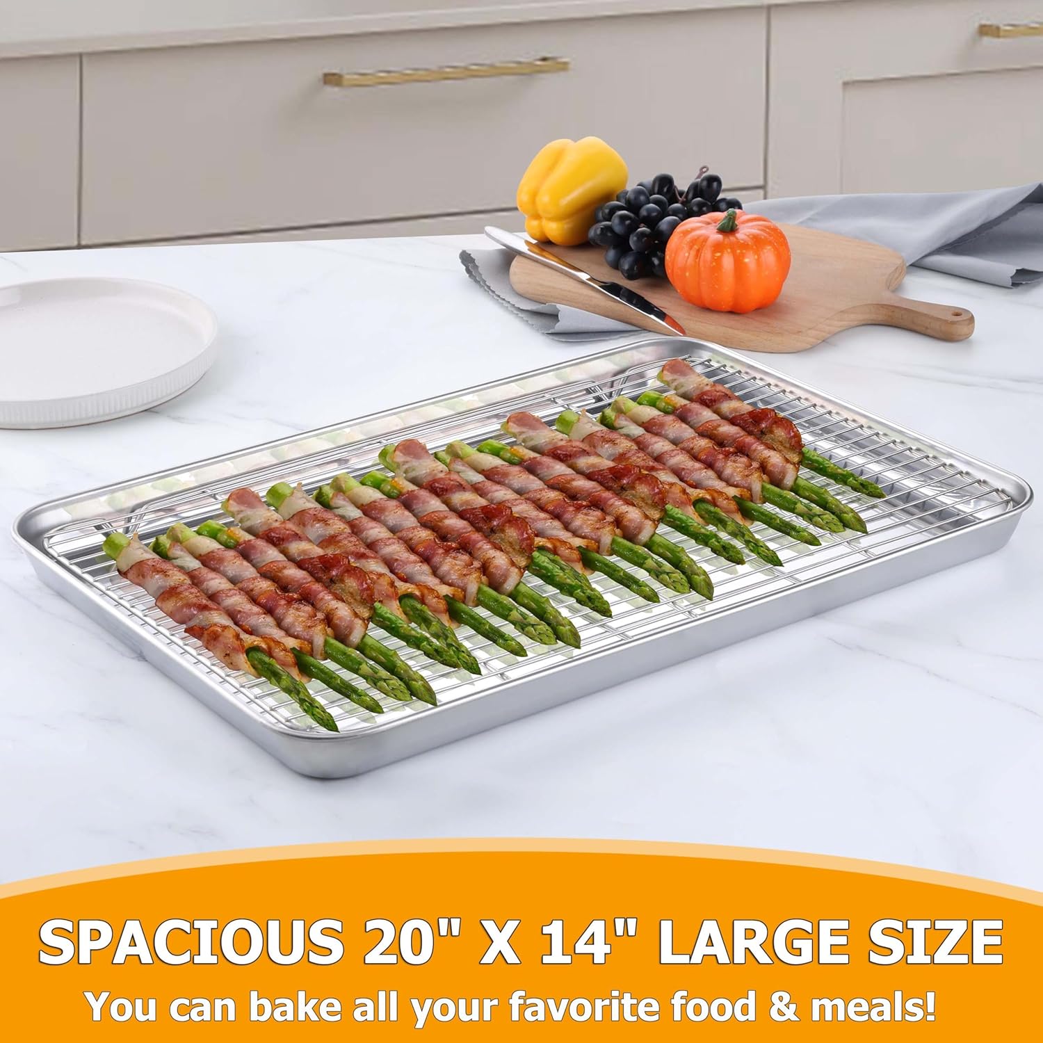 - Premium material, large 20 inch baking sheet with wire rack set is made of stainless steel without any chemical coating, free of rust and corrosion, safe for oven and perfect for roasting cooking, durable for home kitchen restaurant usage, a great replacement of aluminum or ceramic ones