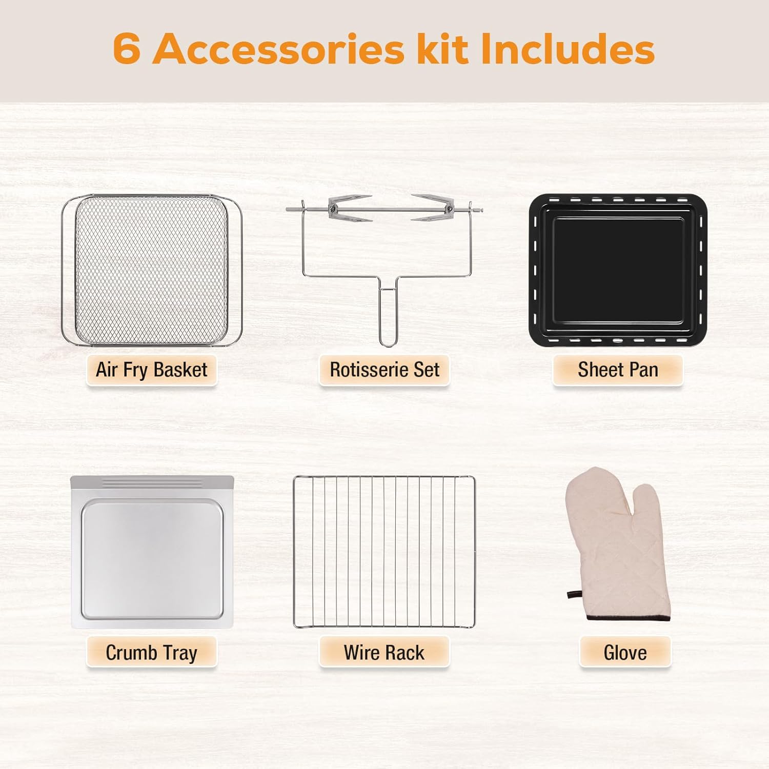 - 📦 6 Accessories for Everything: Air fry basket, wire rack, crumb tray, rotisserie kit, roast basket and glove.
