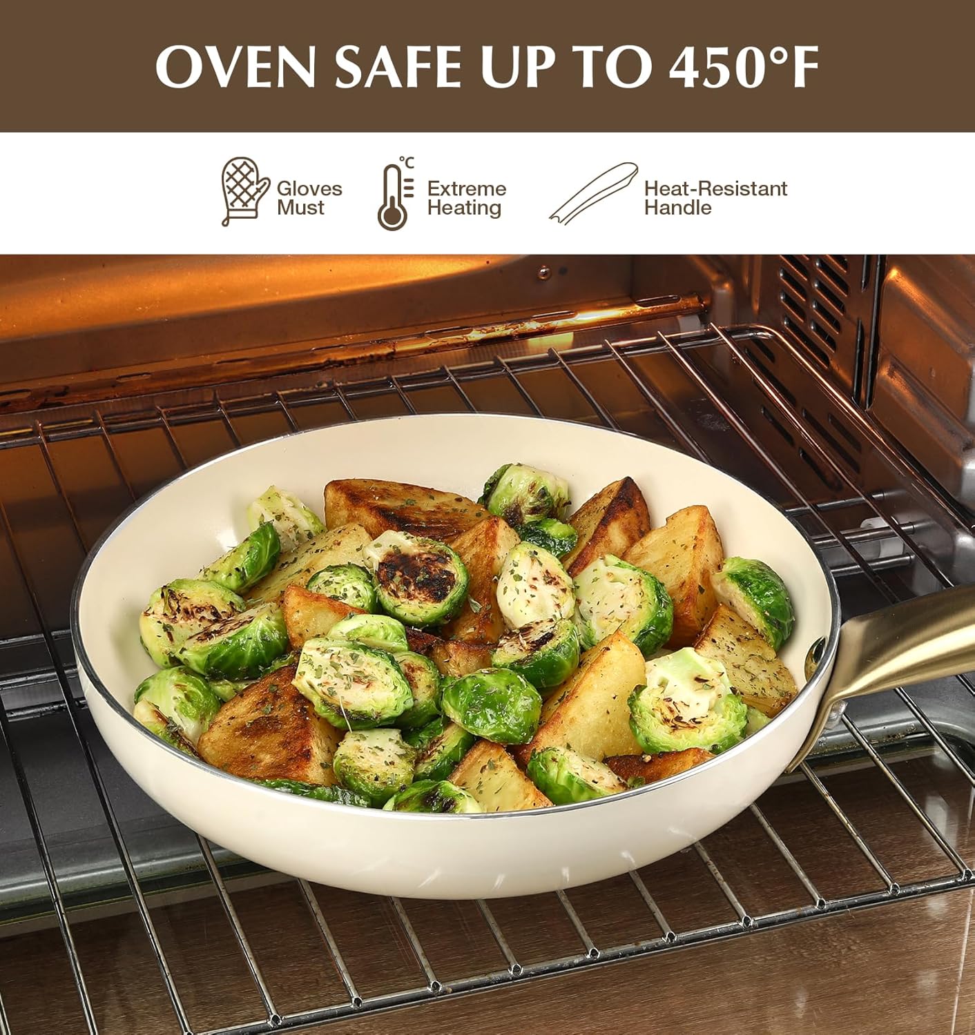 KOCH SYSTEME CS Nonstick Frying Pan with Lid, 10 Inch Non-Stick Skillet with Gold Stainless Steel Handle, Omelet Pan with Nonstick Ceramic Coating, PFOA Free, Induction & Oven Safe, Cream White