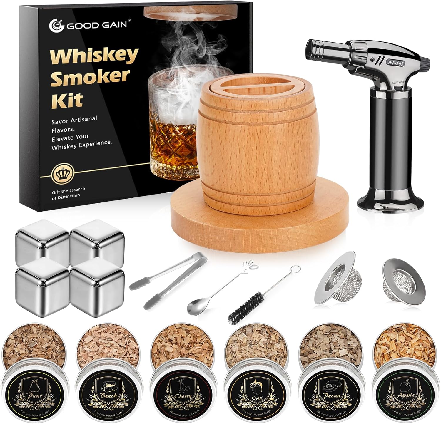 G GOOD GAIN Whiskey Smoker Kit with Torch - Old Fashioned Cocktail Smoker Kit with 6 Flavors Wood Chips | Drink Bourbon Infuser Set with 4 Stainless Steel Ice Stone for Men, Dad (No Fuel Included)