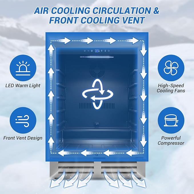 - Built-In or Freestanding Placement - The undercounter fridge features a unique front ventilation design for efficient air circulation. Suitable for built-in installation in kitchens, under cabinets, living rooms, garages, and more. Product dimensions: 22.6"D x 23.4"W x 34.3"H.