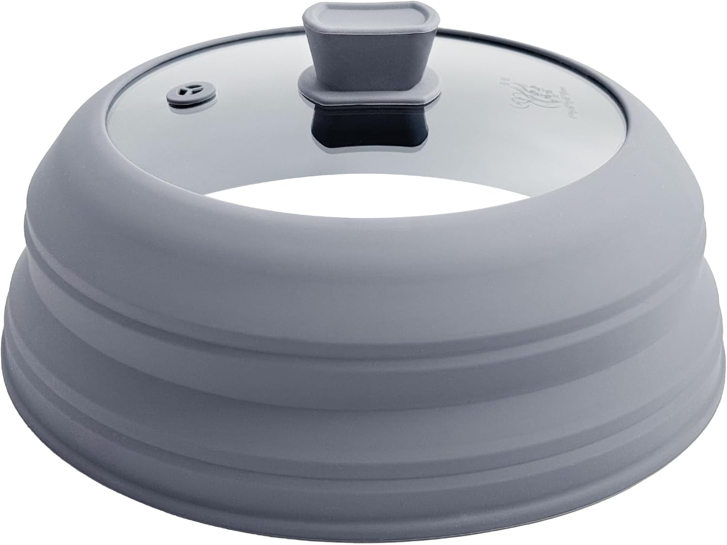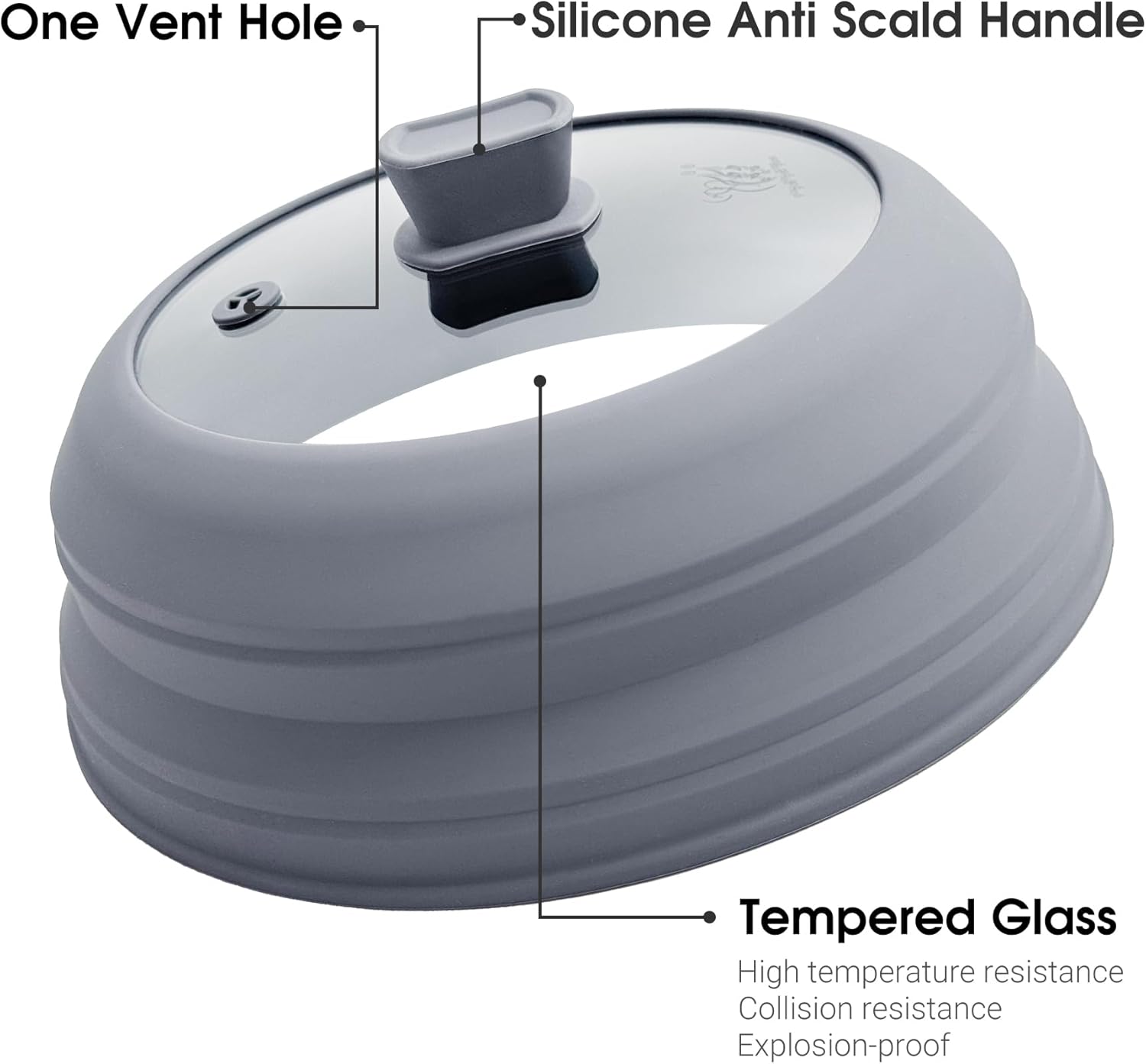 - [Silicone Microwave Splatter Cover] The shatterproof glass microwave cover blocks grease splatters with a BPA-free silicone rim that seals tightly on dishes. Built-in steam vents prevent pressure buildup while keeping your microwave clean. Ideal for reheating saucy meals without messy cleanup.