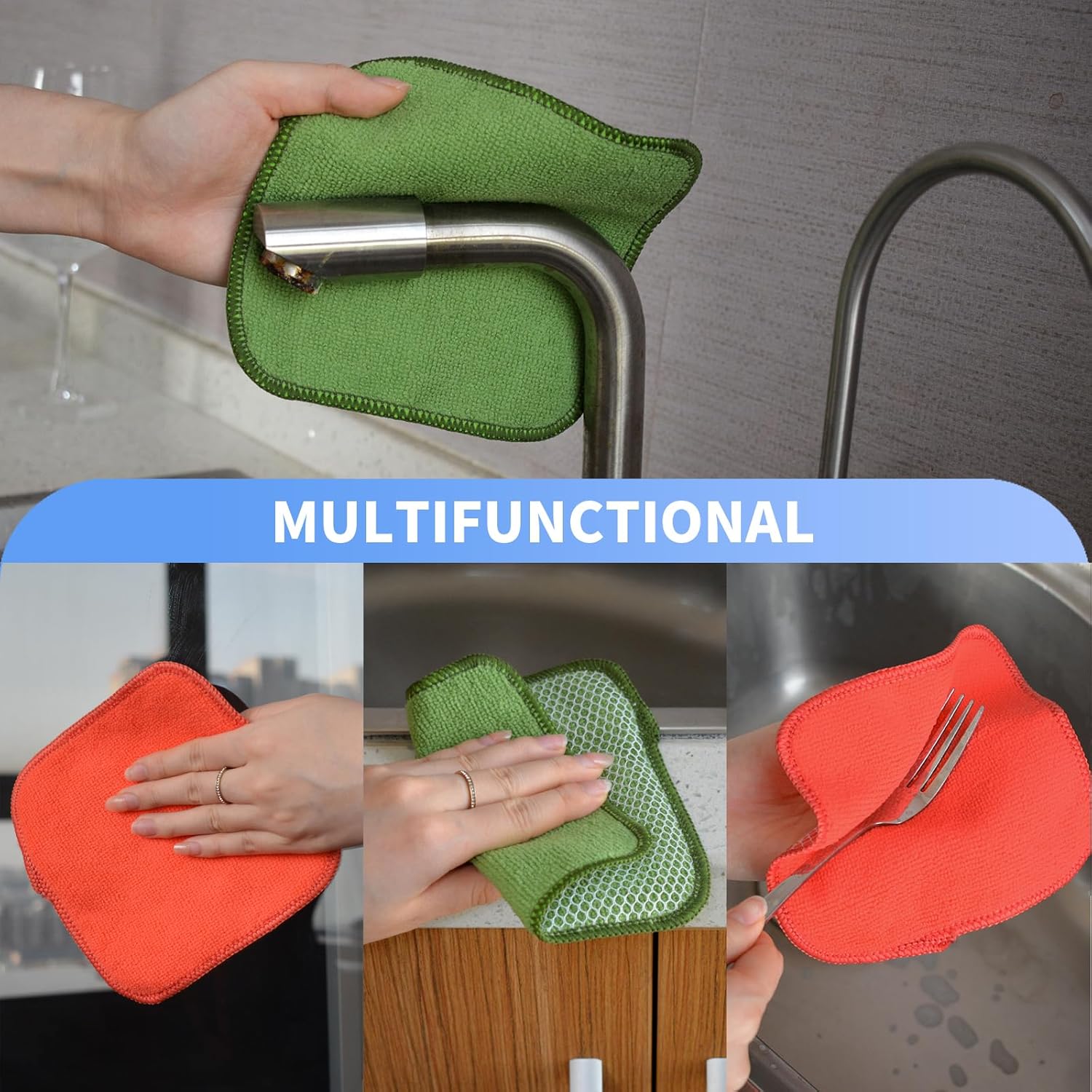 - DISH RAGS FOR KITCHEN CLEANING WITH POLY SCOUR SCRUBBING SIDE: One side is microfiber and the other side is mesh. The microfiber side works well at getting finger spots off the stainless steel appliances and the glass front of fridge or stove, microwave; the scrubby side is good for cleaning stuck on food without having to grab your scraper and does not scratch delicate surfaces either
