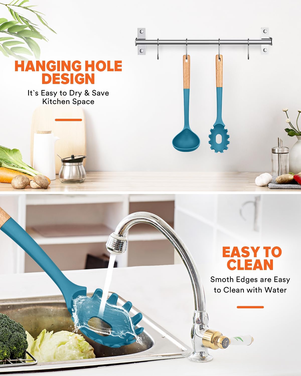 Pasta Fork and Ladle Set, Perfect for Serving Hot Soup, Stirring, and Sauce Pasta, BPA-Free Matte Silicone, Wood Handle Spaghetti Spoon for Nonstick Cooking Surfaces (Blue)
