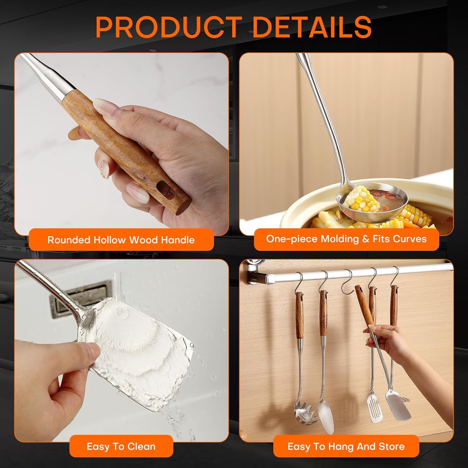 - 【Kitchen Utensils Stainless Steel Set】 :Wooden Handle and Made in food-grade heavy-duty 18/8 stainless steel which, this a great gift for friends and family who love cooking with premium metal kitchen utensils