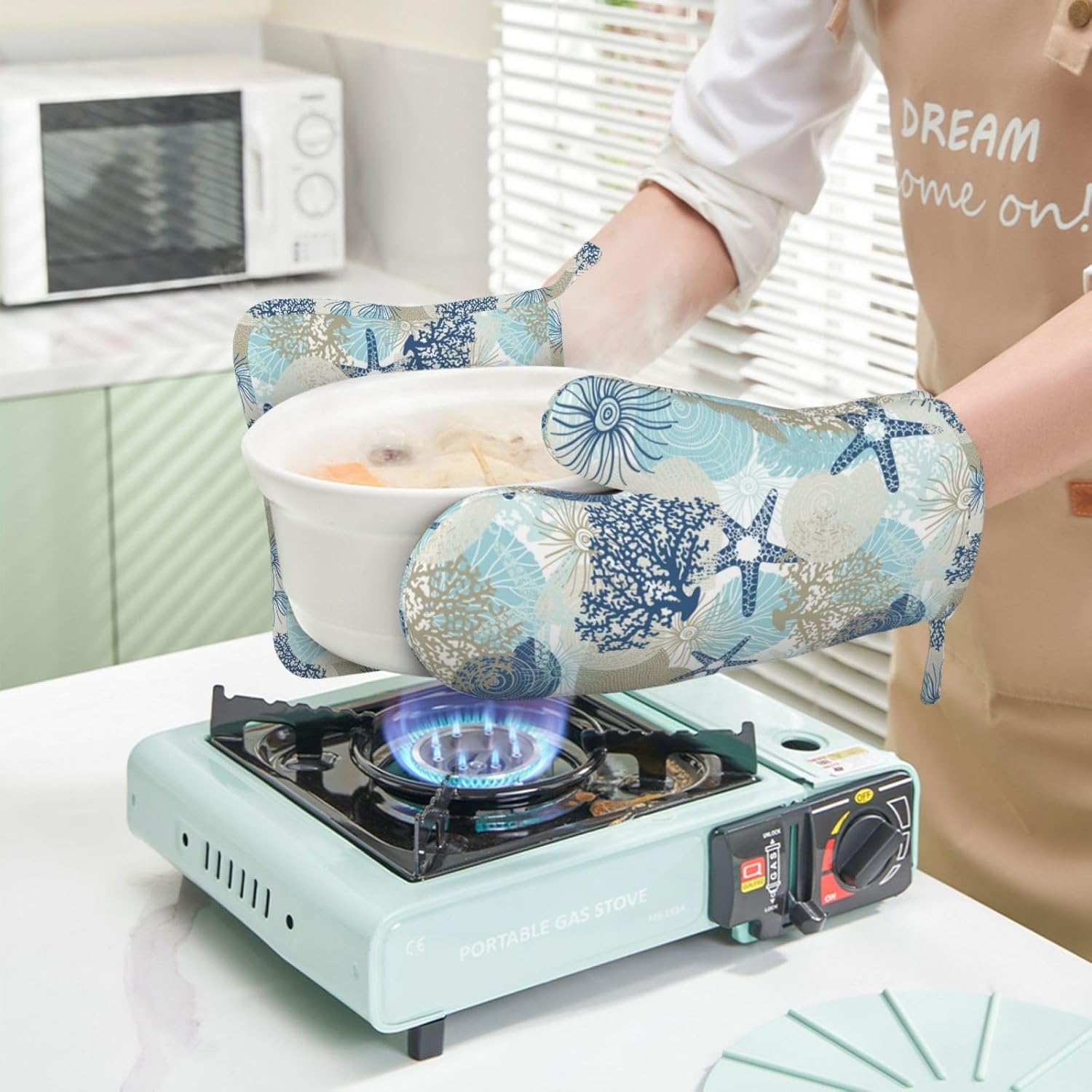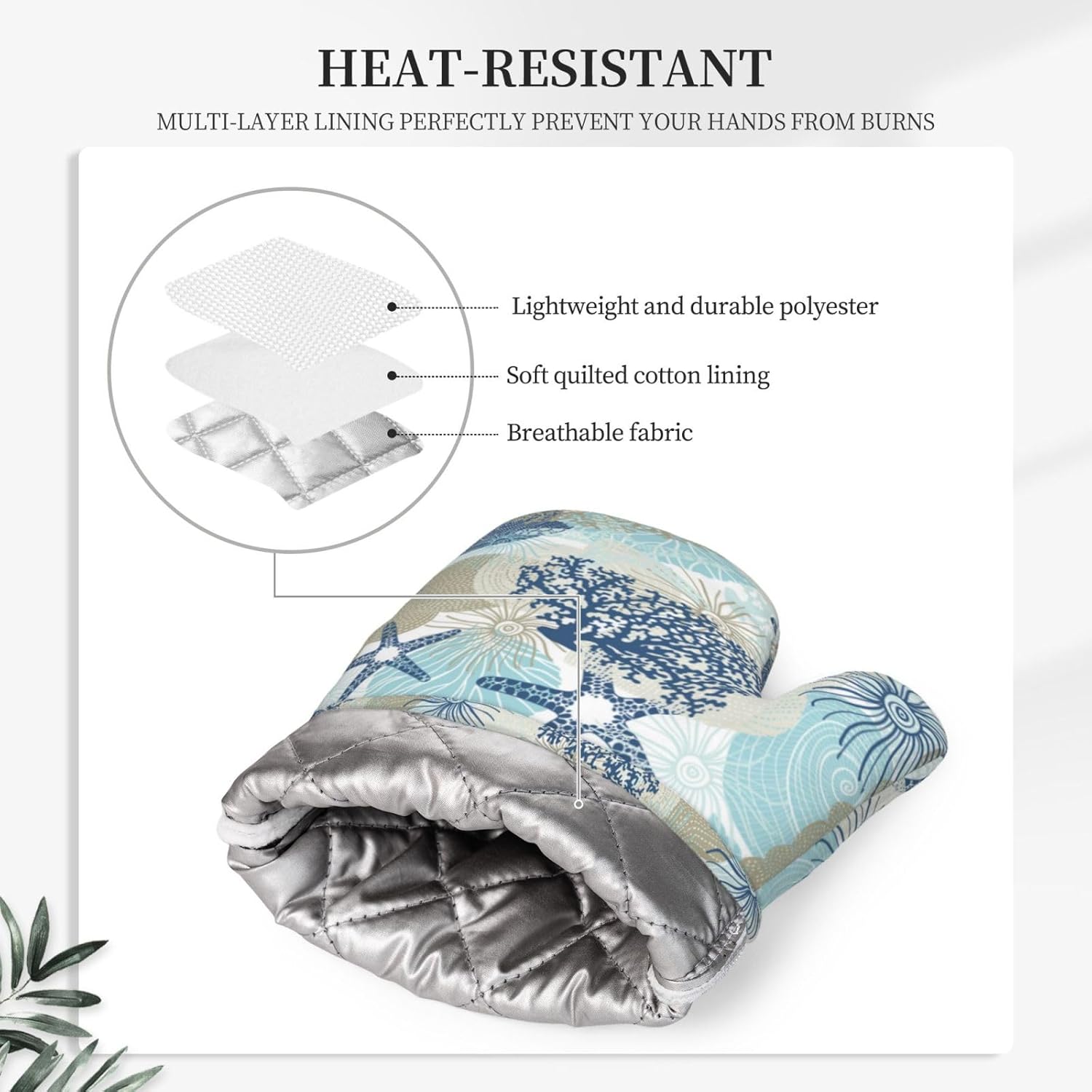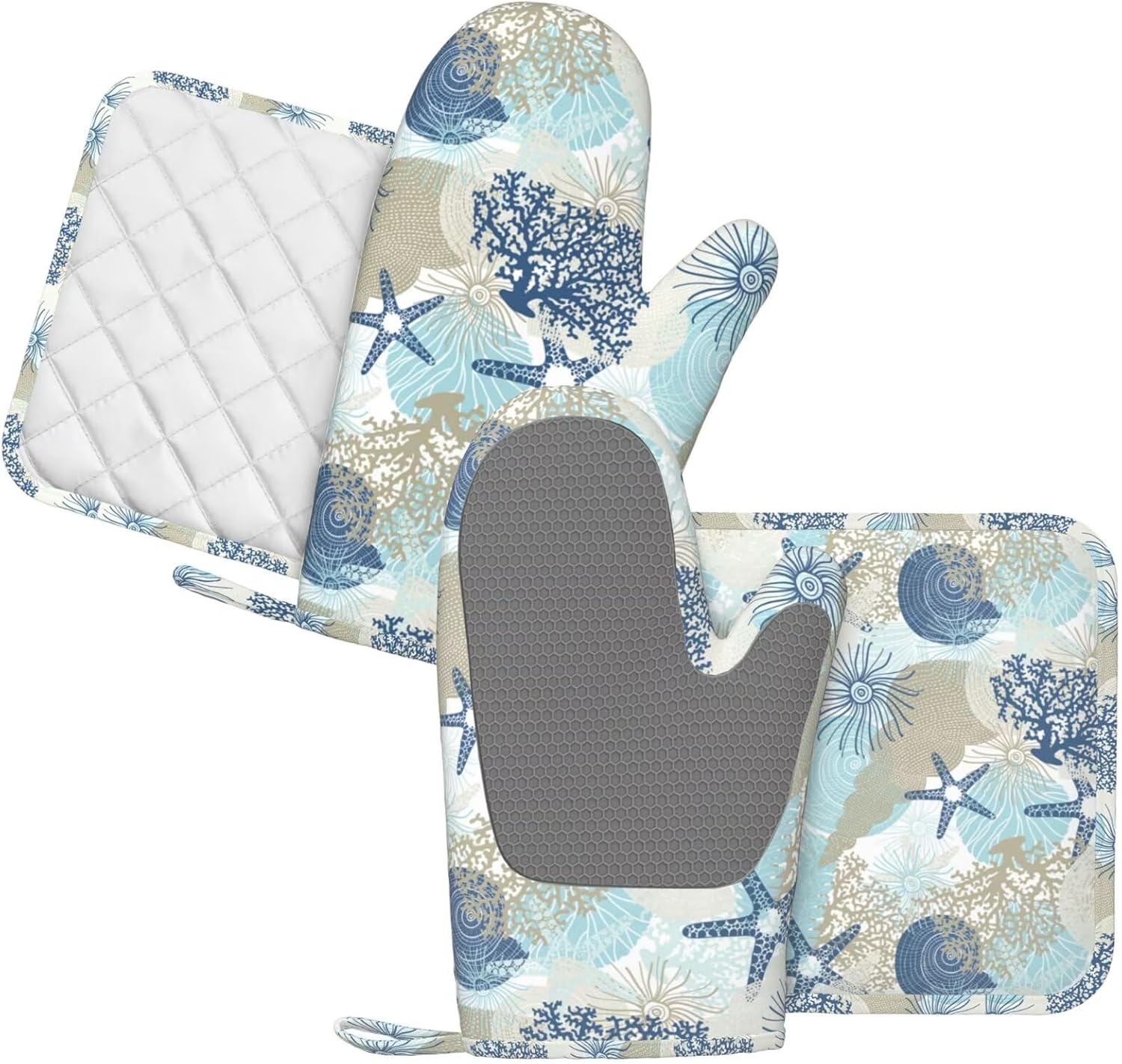 - NON-SLIP GRIP: The starfish seashell coral algae beach themed blue oven mitts feature a textured, non-slip surface that enhances your grip and control when handling hot items. This provides you with a secure hold, reducing the risk of accidental slips or drops while transferring dishes from the oven or stovetop