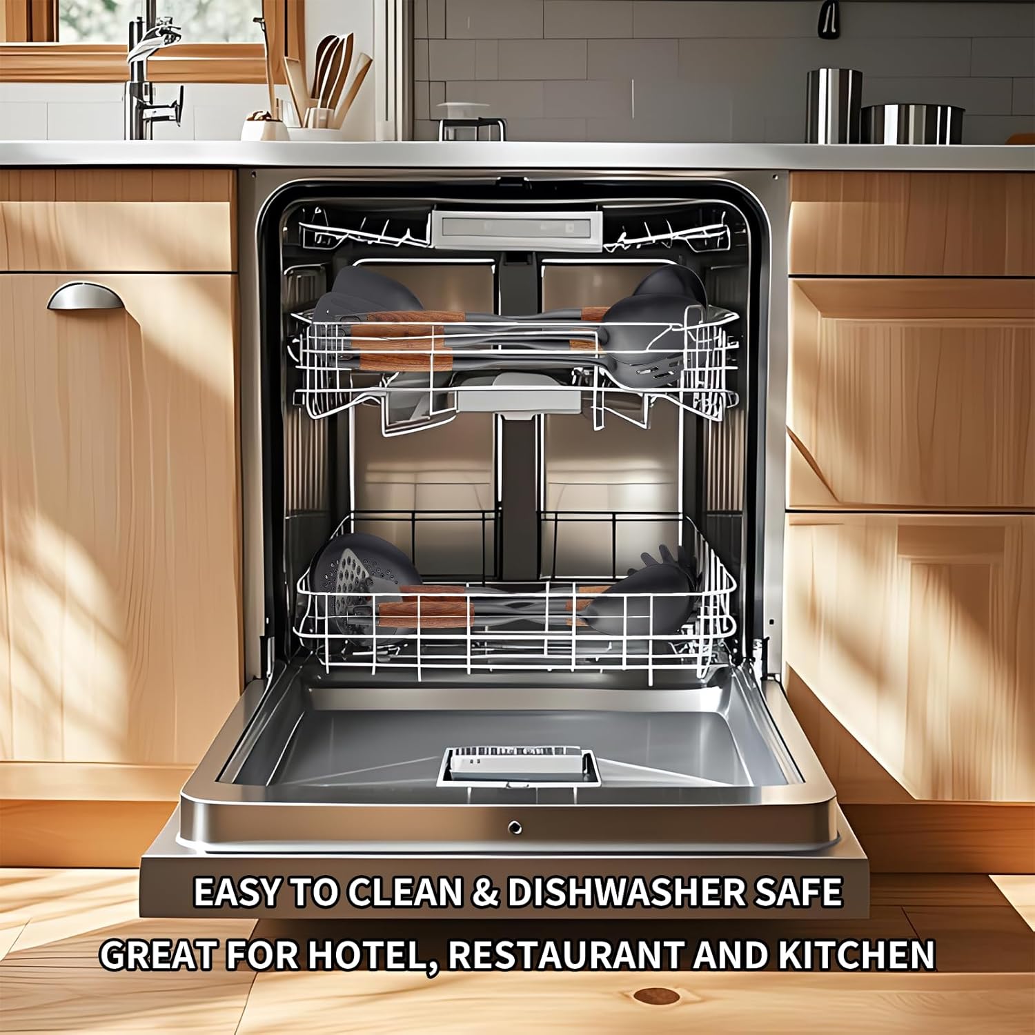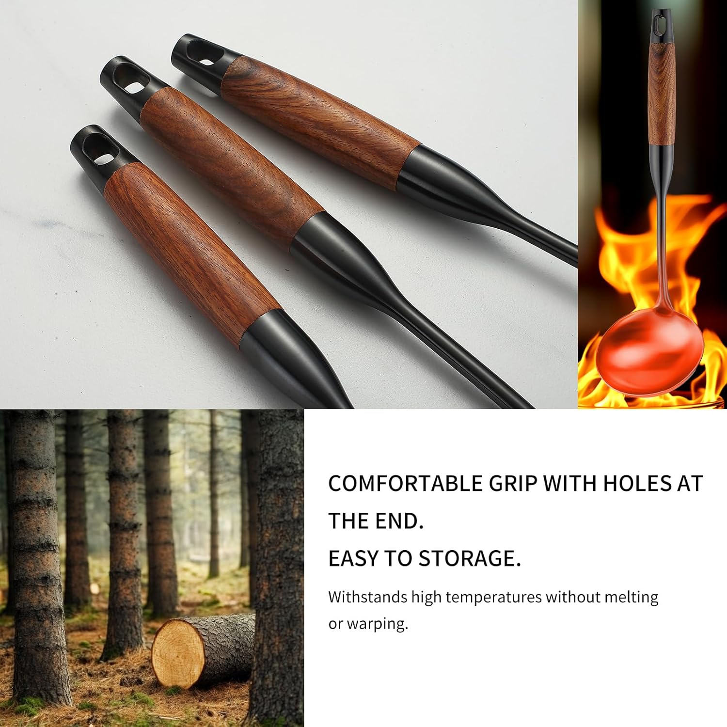 - 15inch Long Kitchen Utensil Set: Ergonomic design, idea weight, excellent grip. the unique grain of the rosewood handle is exceptionally beautiful, silky to the touch, and offers high heat resistance, the 15-inch length ensures that the chef's hands stay cool during everyday domestic or commercial use