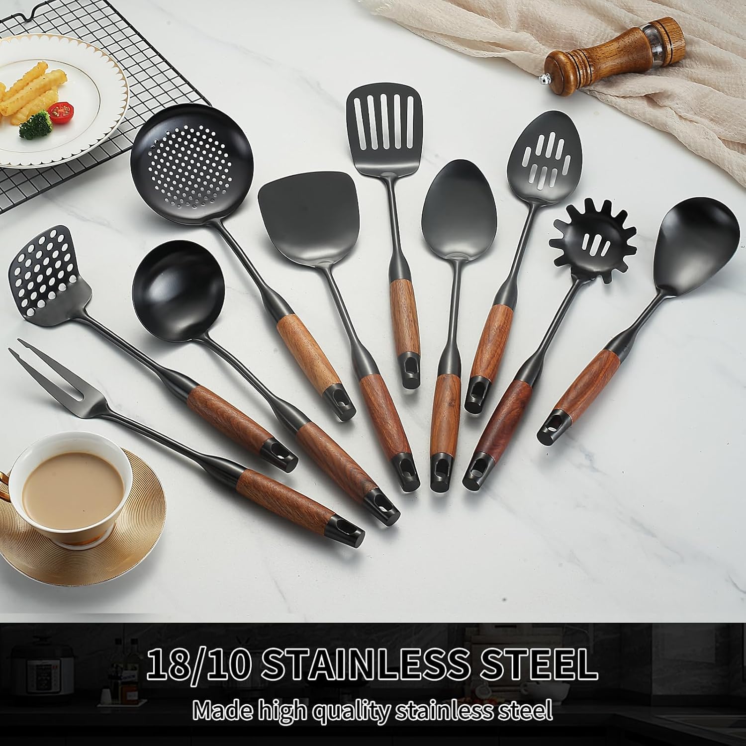 Stainless Steel Kitchen Utensils Set with Wood Handle, 18/10 Metal Cooking Utensils Set, 10-Piece - Spatula, Spoon, Ladle, Skimmer, Slotted Turners, Pasta Server, Fork, Masher(Dishwasher Safe)