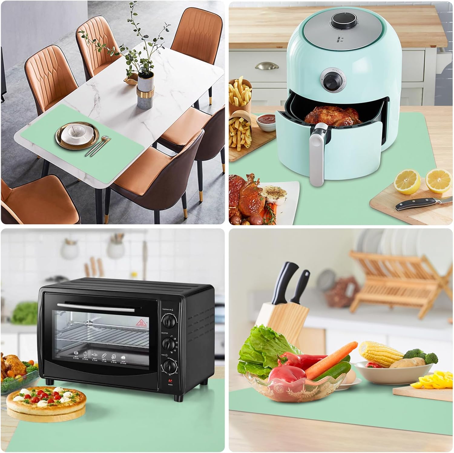 - Non stick & Anti-slip silicone kitchen mat: Different texture design on two sides, non-stick surface are perfect for baking or other food preparing, while non slip bottom adheres strongly and provides great non-slip grip to keep appliances from sliding around, avoiding accidents for daily use.