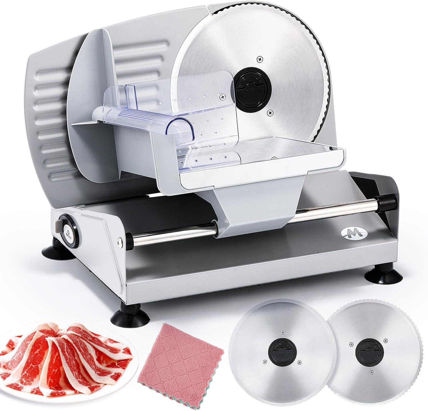 - Dual Blade Choices This deli meat slicer comes with two 7.5-inch stainless steel blades, each suited for different food preparation needs. The smooth blade is perfect for slicing vegetables, fruits, cheeses, breads, and similar items, while the serrated blade easily handles semi-frozen meats, ham, bacon, sausage, etc.