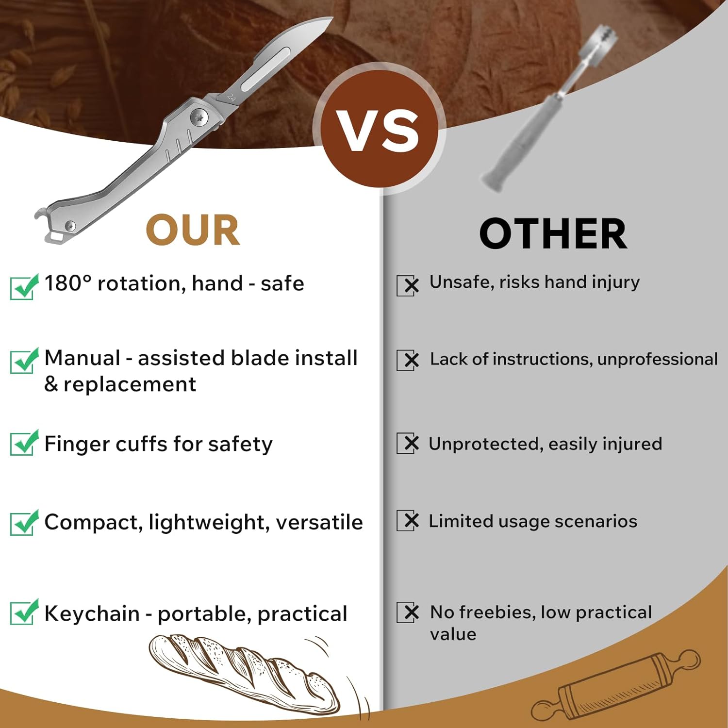 - Safer Bread Scoring Too:Compared to other sourdough scoring tools that have the risk of broken blades or accidental cuts to your hands, our bread scoring knife case include finger cots and blade Replacement Instructions. that ensures a safer and more reliable experience when in use. So you can enjoy the fun of baking and show off your creative work with confidence