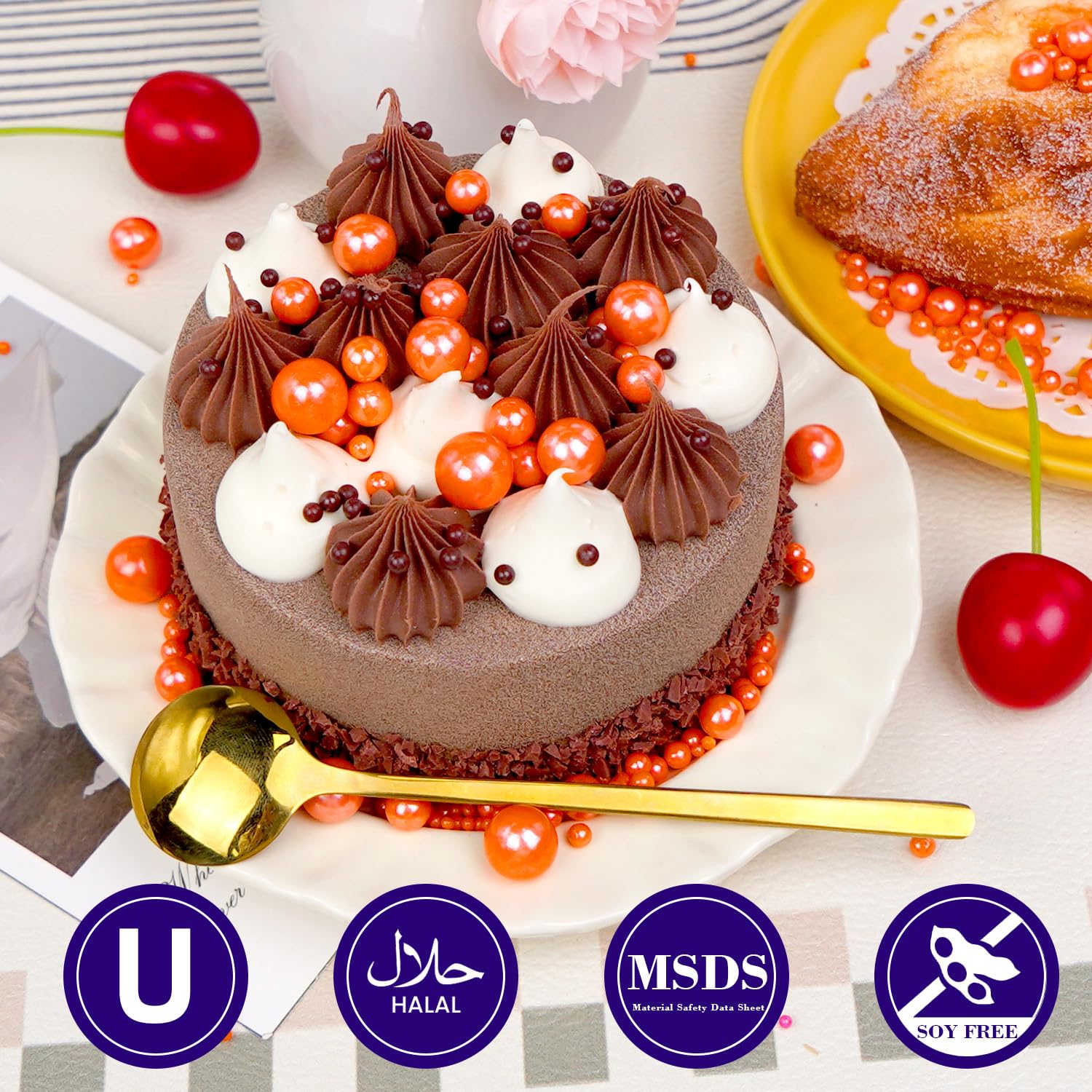 - Edible Orange Pearl Sprinkles with food-grade raw materials. Preservative Free, Nut Free, Dairy Free, Chemical Free, Soy Free, Non-GMO. Produced using food-safe standards, the process does not come into contact with allergenic substances and uses Tamper-proof food label. Have Kosher and Halal Certification.