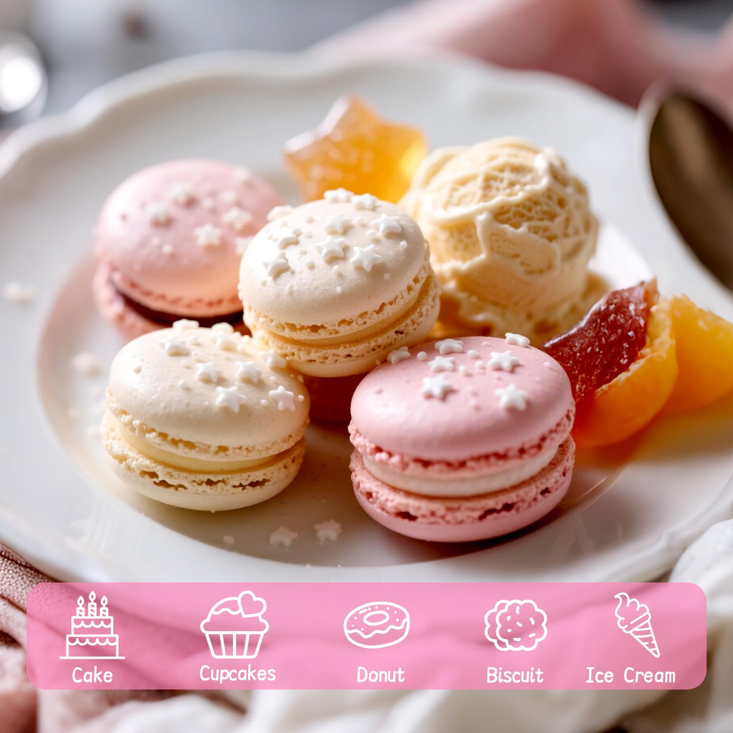 - The Edible White Star Sprinkles feature a unique mixed-size design. They are perfect for birthday cakes, cupcake toppers, cookies, ice creams, waffles, and any dessert. These sprinkles will make your baked goods prettier.