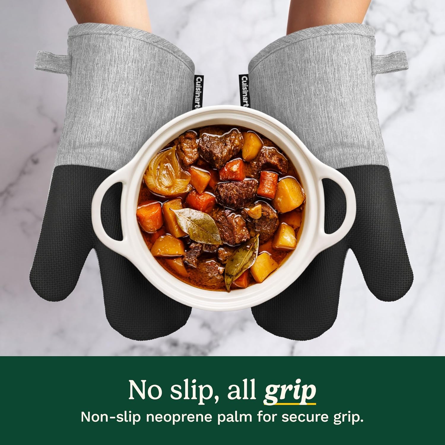 - COOK WITH CONFIDENCE: The Cuisinart Chambray Oven Mitt Set, measuring 7 x 13 inches, features a heat-resistant neoprene palm for superior protection (up to 350 degrees); handle hot cookware with ease and enjoy a secure grip with these oven mits, making cooking, baking, and grilling safer.