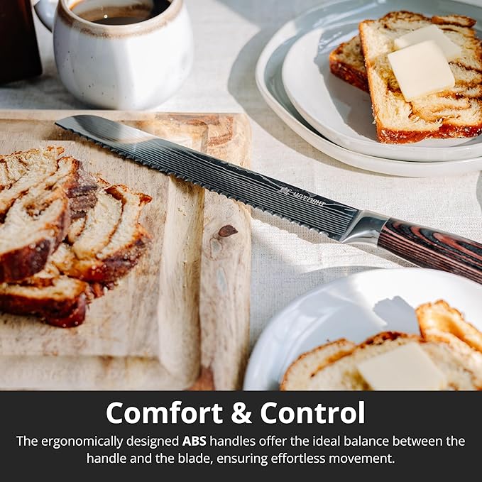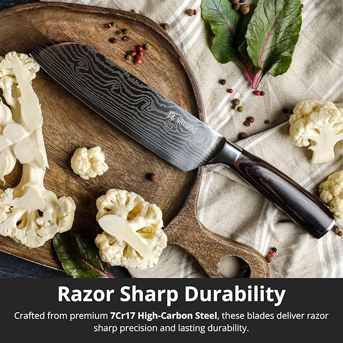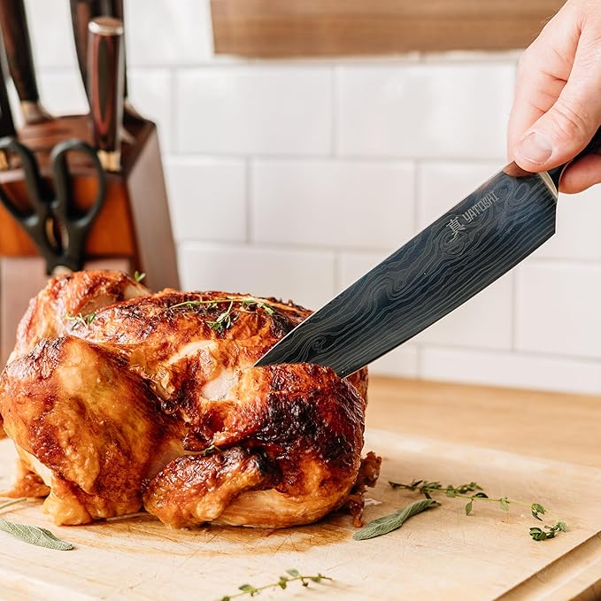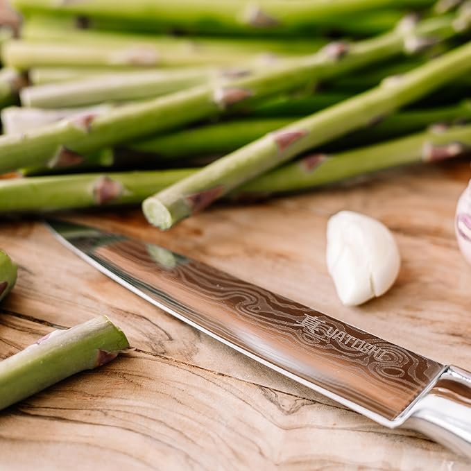 - High Carbon Blades: Made with premium 7Cr17 High Carbon Steel that provides a razor-sharp professional quality blade. The steel contains 0.6-0.75 carbon, making it two times tougher than other knives in its class with a Rockwell Hardness of 57-58. Each blade is finished with an elegant waved pattern that adds a touch of artistry while highlighting its precision craftsmanship.