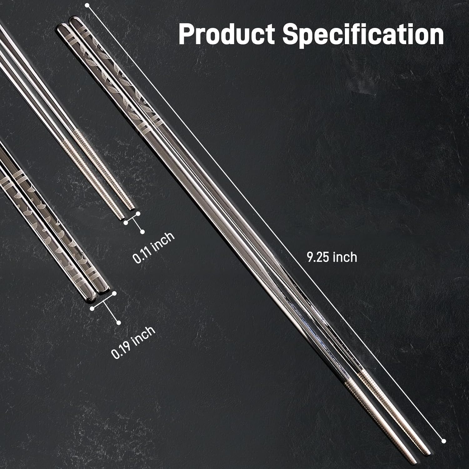 - Unique carved pattern metal chopsticks: Our metal chopsticks feature unique laser engraved patterns and come in 5 different designs, making it easy for every family member or guest to distinguish their chopsticks. These stainless steel chopsticks not only enhance the dining experience, but also add a delicate touch to your tableware