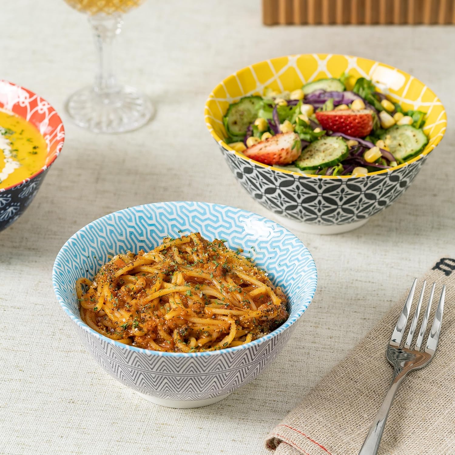 Bowl Set of 4, 23 OZ Large Colorful Bowls Set, 6 Inches Boho Bowls, Bohemia Ceramic Bowls for Kitchen Soup Cereal Salad, Dishwasher and Microwave Safe