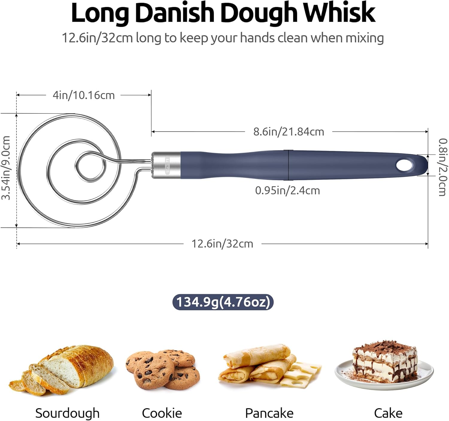 - [Heavy Duty Ergonomic 8.6in Long Handle] Are you still worried about your blender's mixing head falling off wooden handle? Compared to others’ wood handle, U-Taste’ sourdough whisk chooses silicone handle, which bonds more firmly to the stainless steel, offers comfortable, non-slip grip, allows long-lasting and heat-resistant use. No more breaking, falling off or food safe issues. 8.6in long keeps your hands clean from sticky dough. 0.95in wide allows mix heavy doughs without hand fatigue.