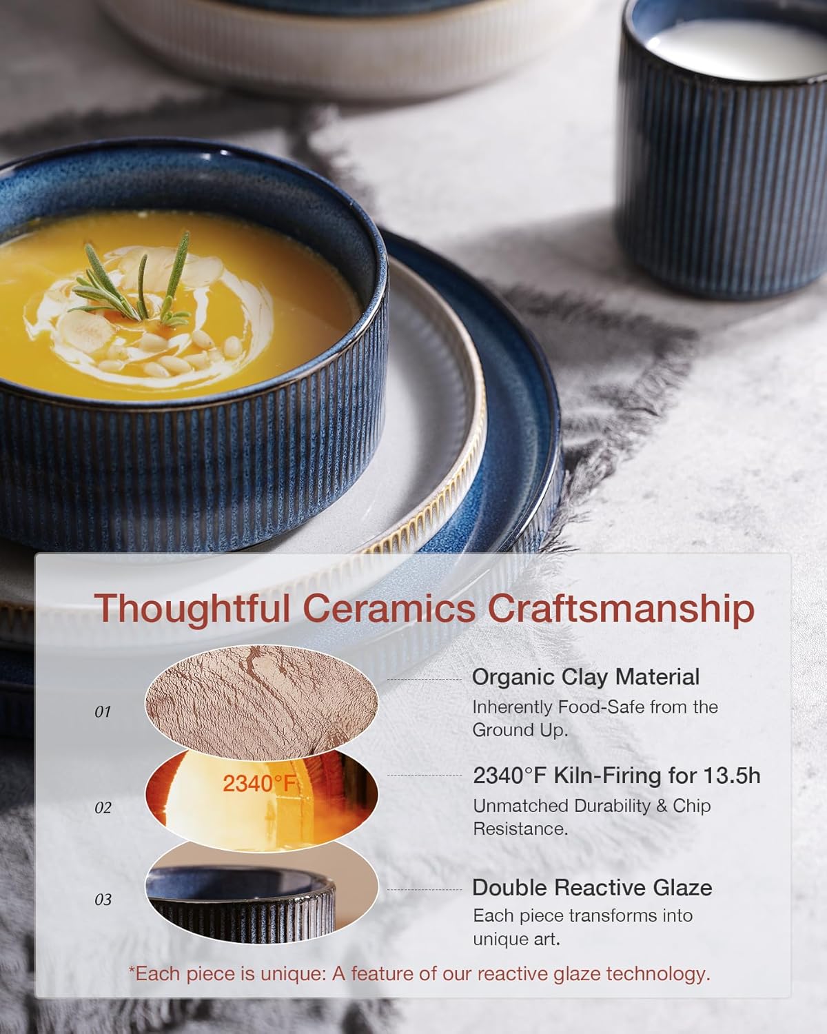 - [Premium Ceramic Durability]: Fired at 2340°F for 13.5 hours, our dishes boast impressive weight and thickness. They can resist chipping, scratching and daily wear, ensuring reliable kitchen use. Enjoy worry-free daily use, even with silverware