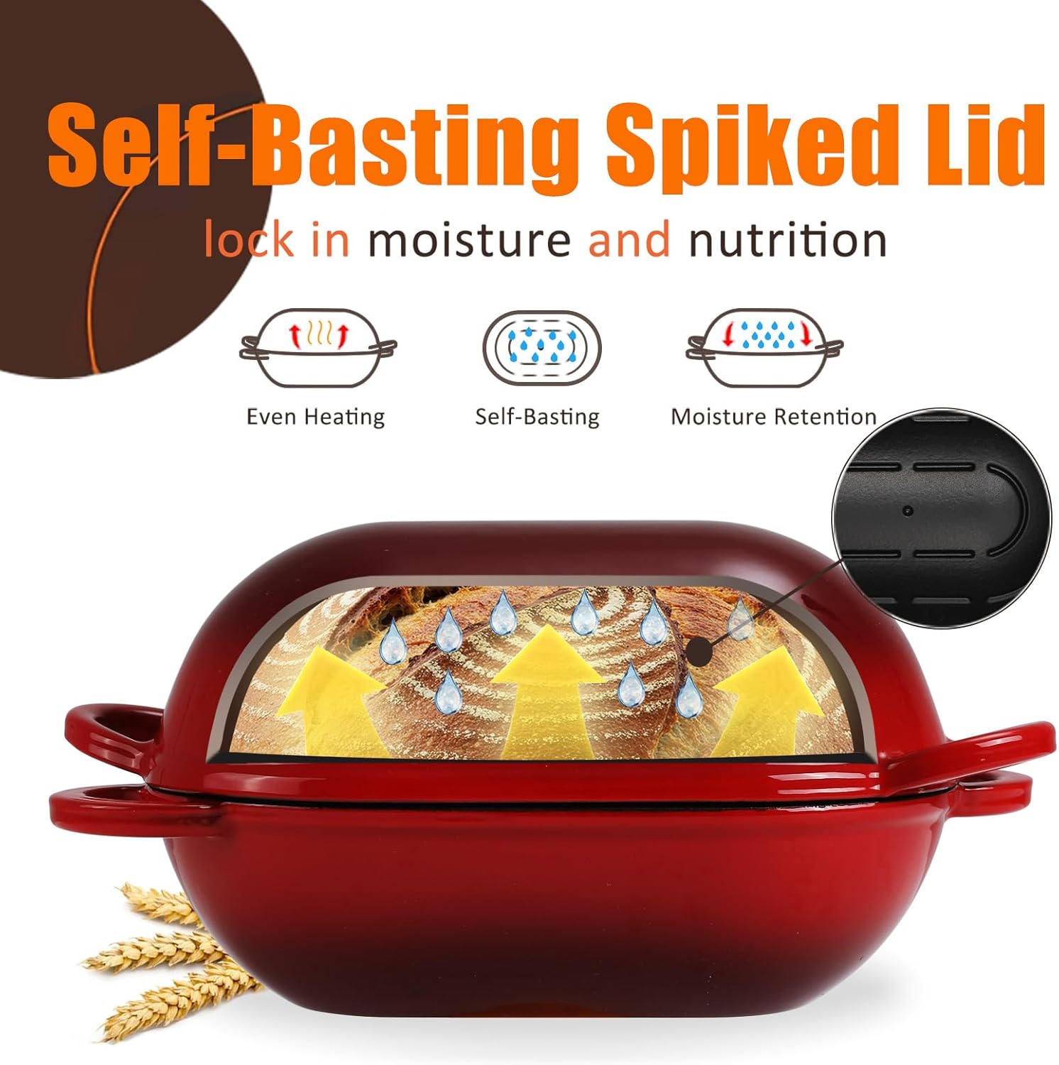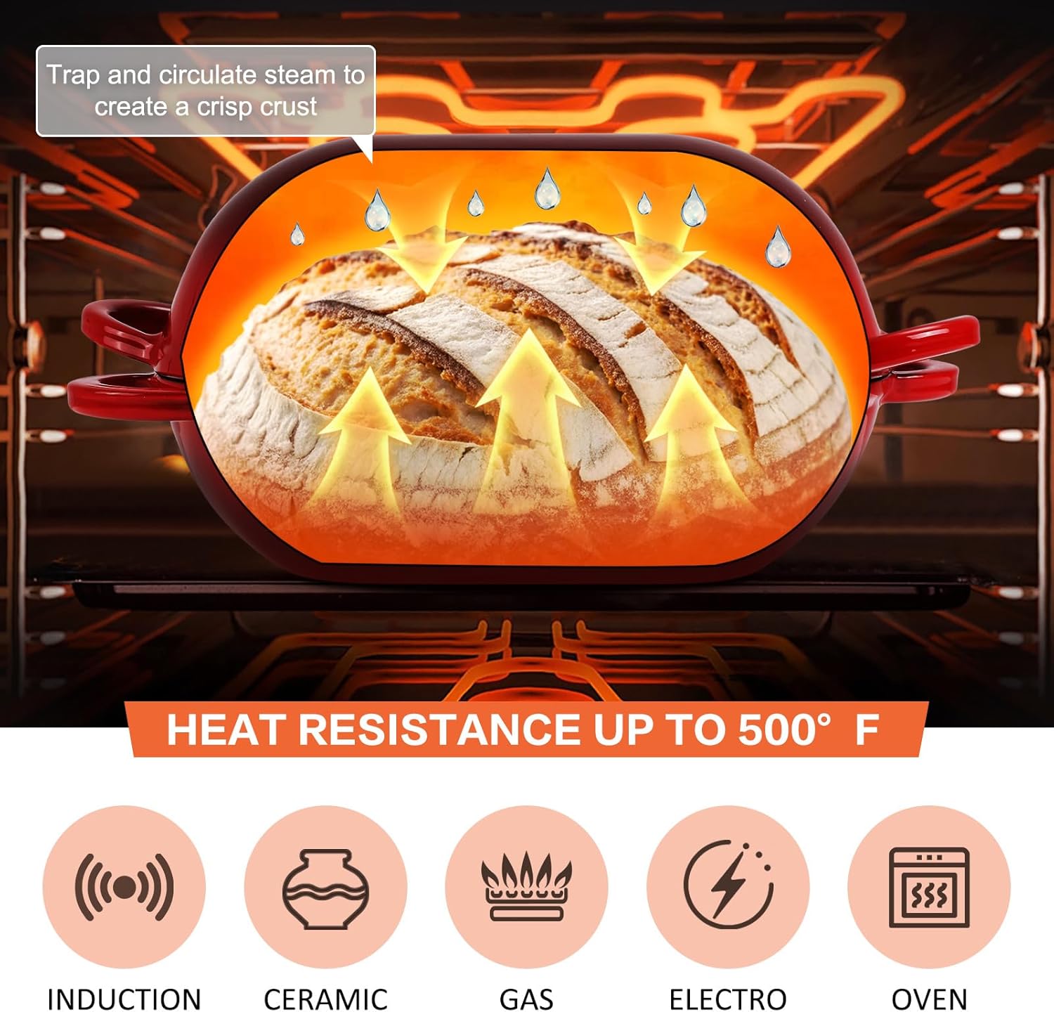 - Feature: The oval dome lid of this oval bread oven traps steam released during baking to produce a caramelized, crispy crust, preventing the crust from curdling, drying out or baking too quickly before rising. The ergonomic handles make lifting easy and comfortable