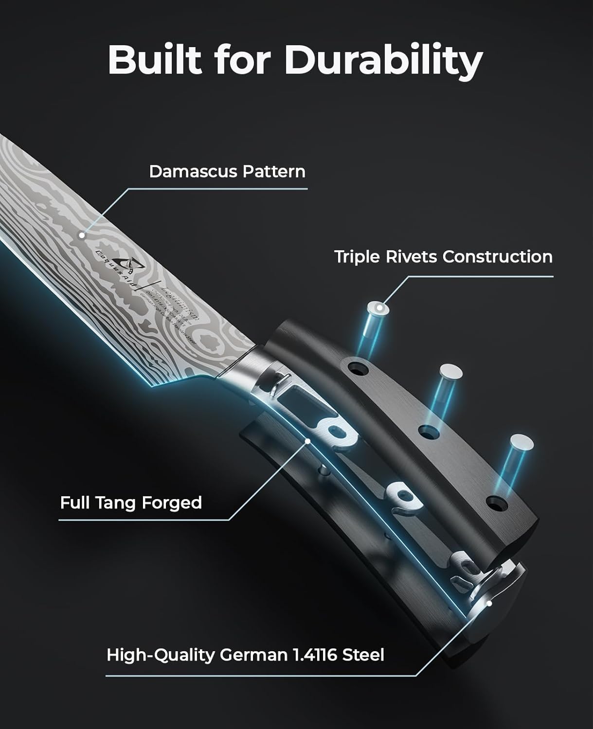 - 4.【Full Tang Ergonomic Handle】 — Built with a full tang, fully forged construction and a triple-riveted black ABS handle, this professional-grade knives set offers superior strength, stability, and durability. The ergonomic design ensures a comfortable grip and perfect balance, reducing hand fatigue during extended use. Whether you're slicing, carving, cutting, coring, or peeling, this cuchillos de cocina profesional gives you the control and confidence.