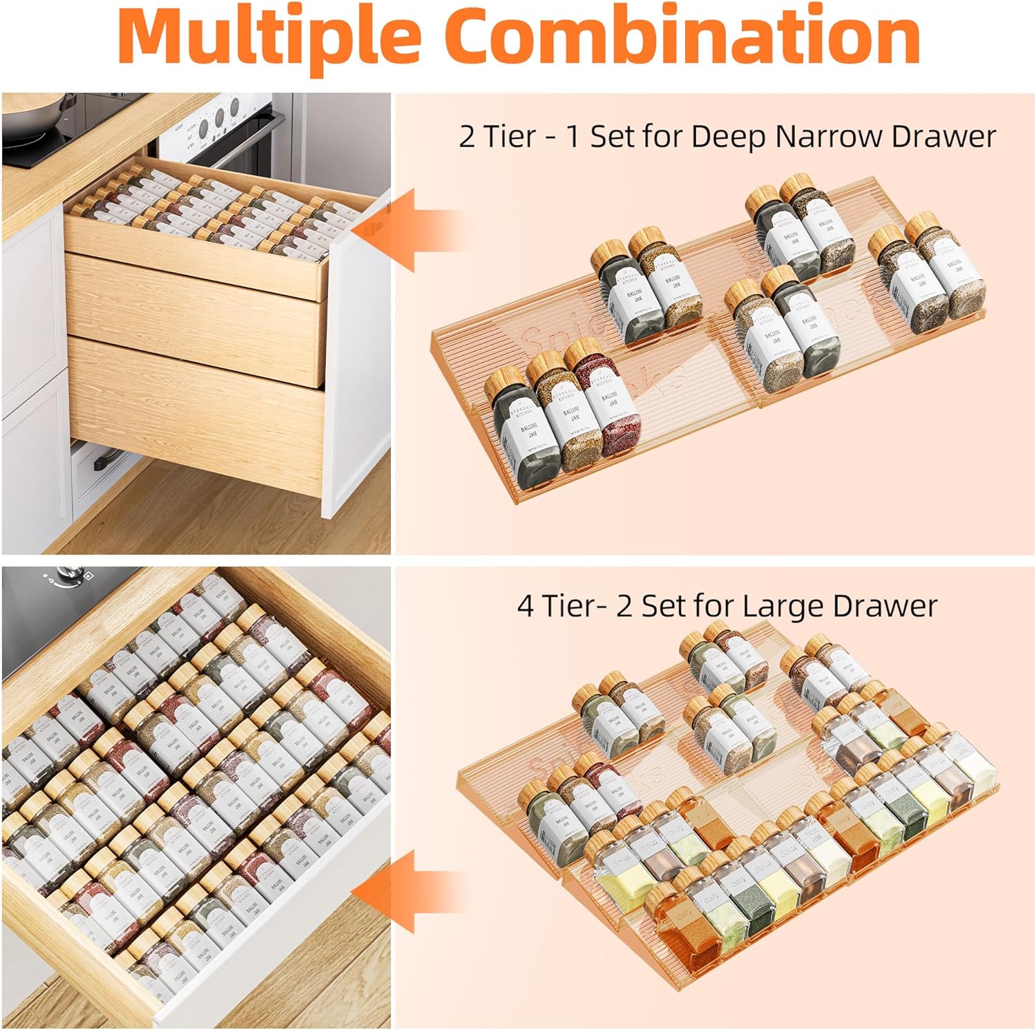 - Customize Your Spice Storage: Enhance your culinary space with our spice rack that adapts to your needs. This horizontally expandable spice organizer is designed to fit drawers from 10.63'' to 21.14'' in width. Opt for the compact 2 Tier- 2 Pack for shallower drawers or maximize your capacity with the 4 Tier- 4 Pack for deeper storage options. Create a seamless spice solution tailored to your kitchen