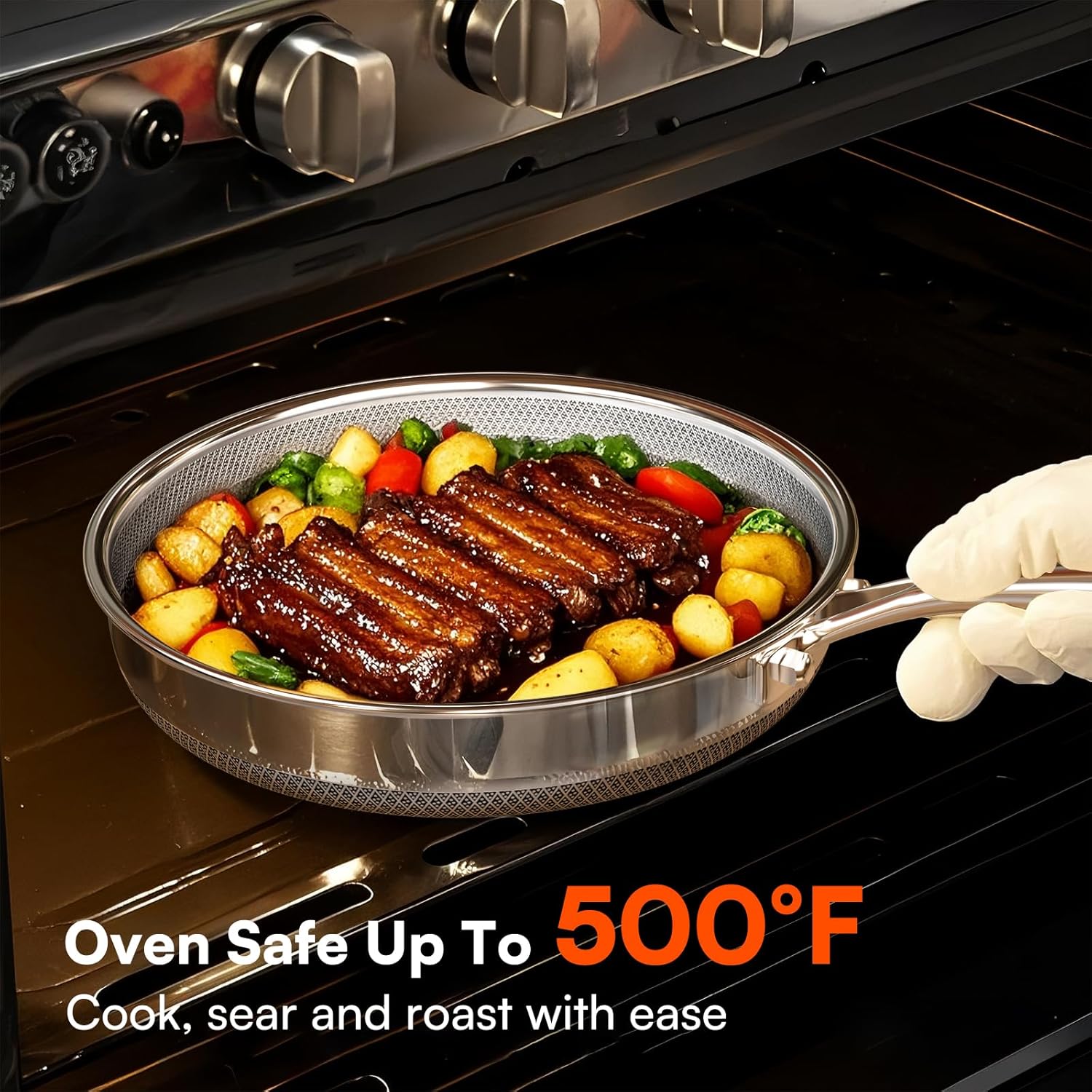 - Superior Durability:KURRUNGIE Nonstick Frying Pans use five construction, with aluminum between stainless steel layers for quick, even heating and easy food release. stainless steel pan The hollow handle stays cool to prevent stovetop overheating.