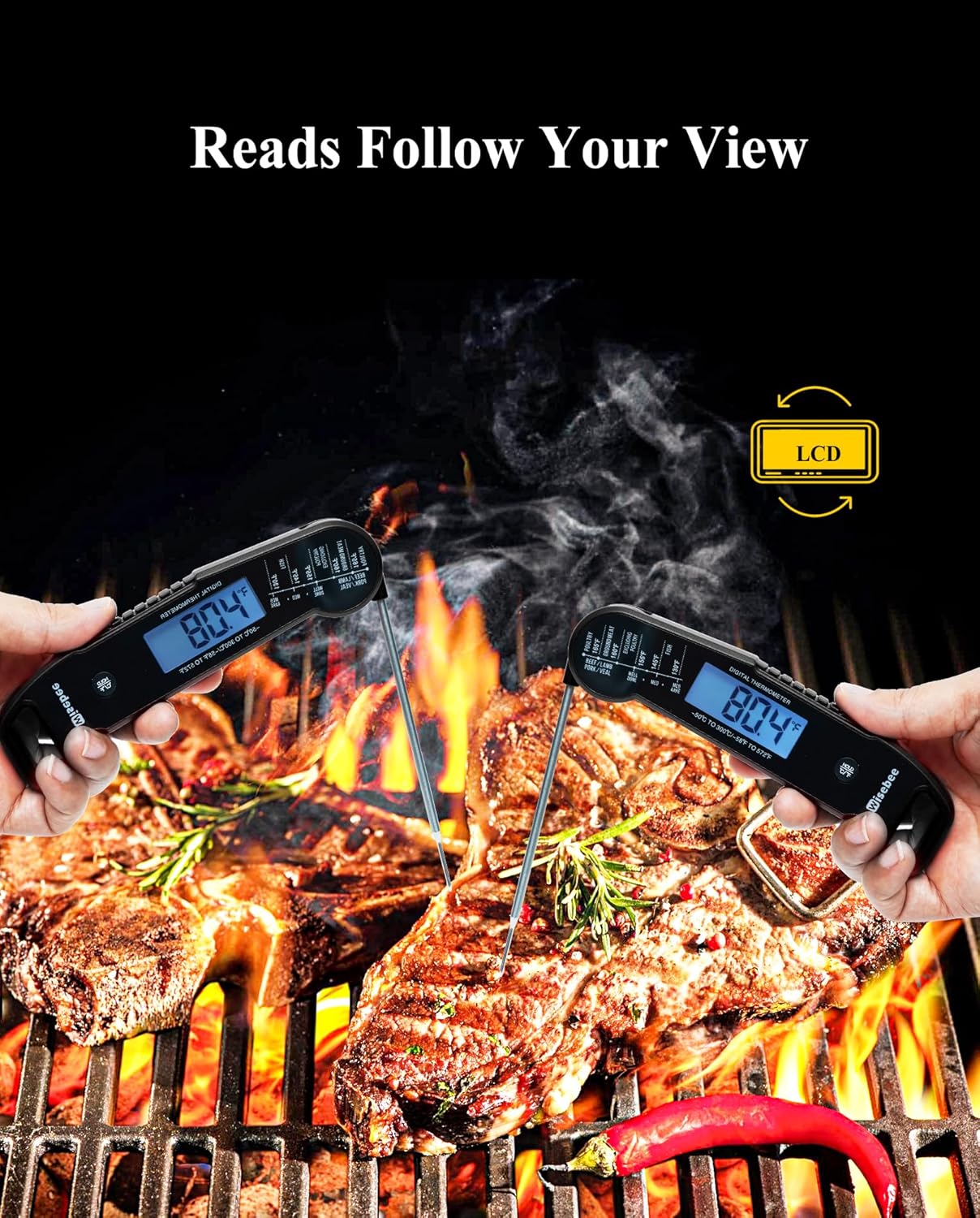 - [Easy to Operate] The meat thermometer probe can fold 180° freely, temperature measurement at any angle. Folding/unfolding the meat thermometer is auto off/on. Anti-slip handle, no slip, no fall.Temp guide to help with cooking