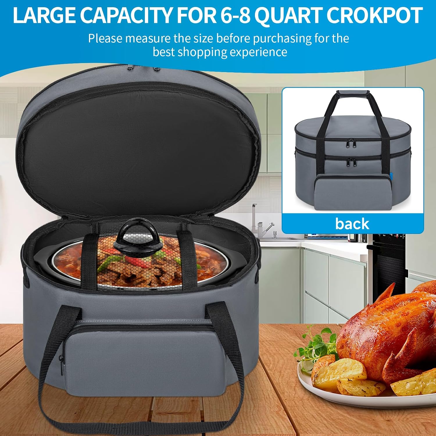 Double Layer Slow Cooker Travel Bag Compatible with 6, 7, 8 Quart Crock-Pot, Insulated Travel Carrier with Easy to Clean Lining, Grey