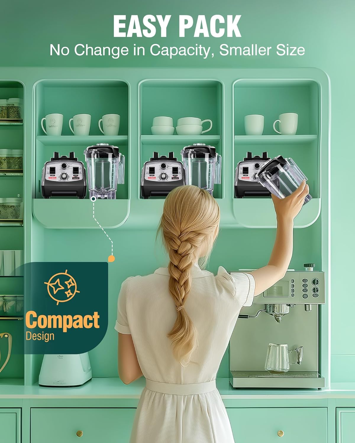 - COMPACT 2L PITCHER: Our 64oz (2L) pitcher features a shorter and more compact design that fits easily under kitchen cabinets and takes up less countertop space. Despite its reduced height, it still delivers full capacity—perfect for preparing up to 8 servings of juice or smoothies at once