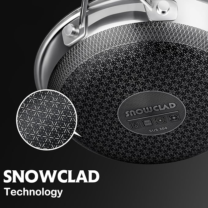 - [SNOWCLAD ENHANCED TECH]: Featuring a cutting-edge enhanced nonstick coating with a snowclad surface design, our non stick frying pans set offers longer-lasting, superior non-stick performance. No more worries about peeling or flaking—this set offers exceptional durability and is designed to withstand the use of metal utensils. Additionally, our clad surface is 50% larger than that of typical hex pans.
