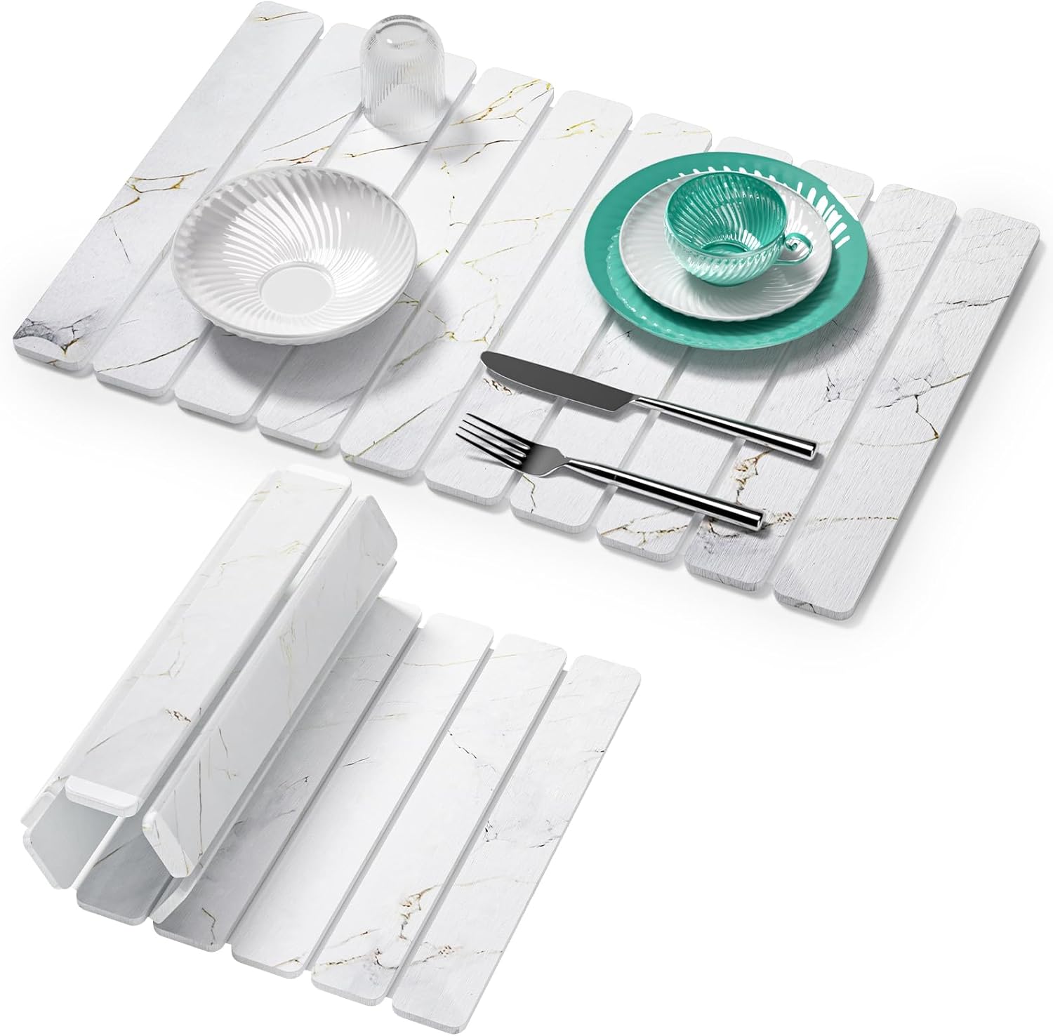 - No place to dry your washed dishes? The countertop is wet and messy? You need this large stone dish drying mat! It can hold all your bowls, plates, and cups at once, instantly making your countertop clean and tidy. The best part is that After use, simply roll it up or fold it, and it shrinks to fit neatly into a drawer! Space-saving max, tidiness max—using this diatomaceous earth mat even makes cooking more enjoyable!