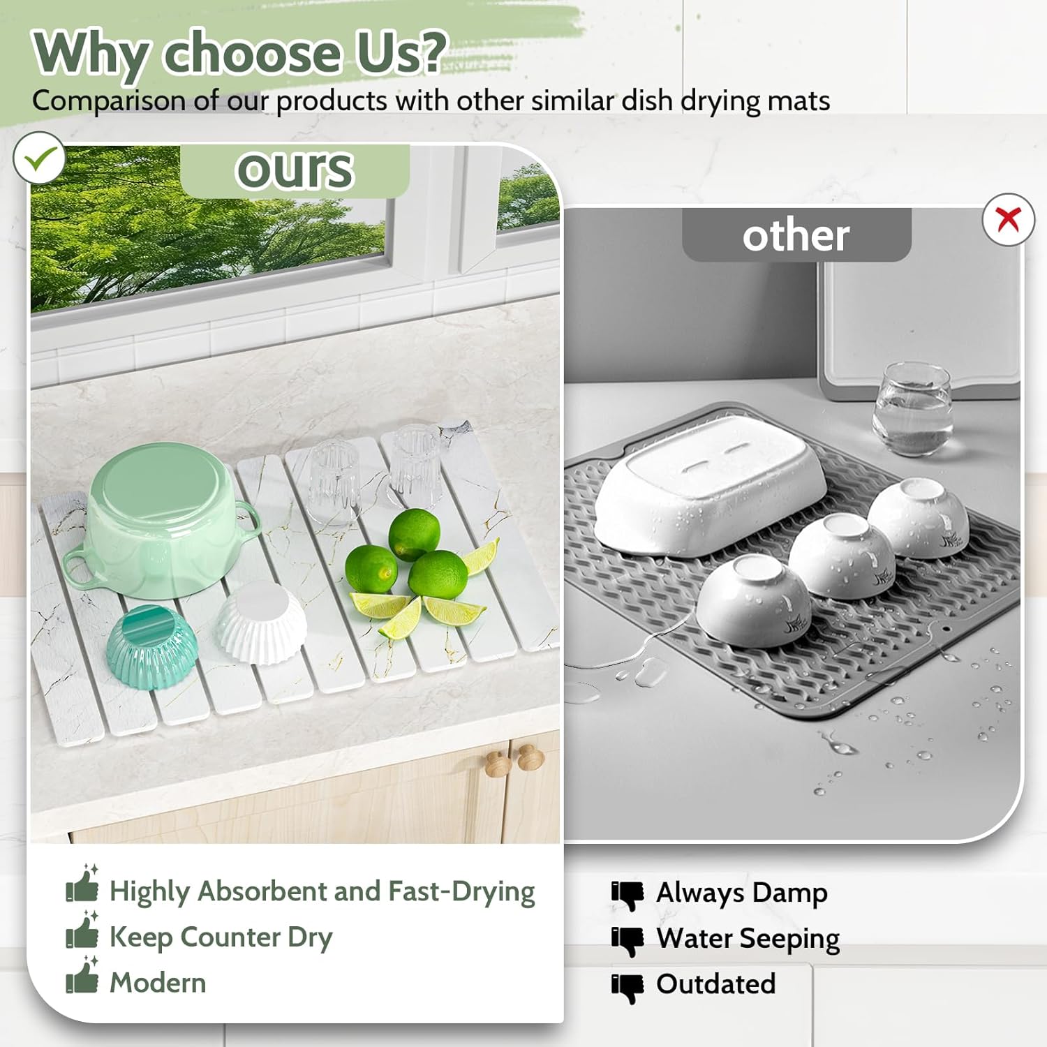 - Quick-dry stone mat kitchen, lightning-fast absorption and drying. Absorbs water five times faster than ordinary stone dish drying mats. The drying mat keeps countertops dry for extended periods of time, eliminating the need for repeated wiping. Say goodbye to damp and odorous kitchen/bathroom countertops.