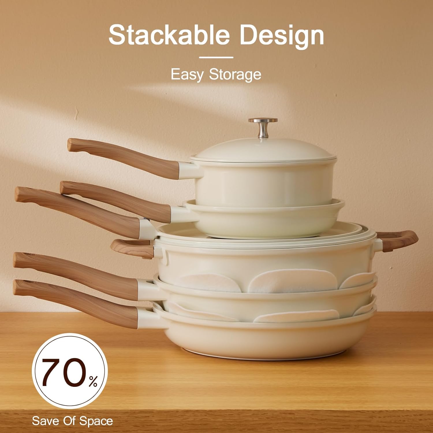 - 【Ti-Ceramic Coating Ultra Non-Stick & Non-Toxic】Engineered with a next-generation ceramic coating enhanced by titanium powder, this non toxic cookware set offers long-lasting nonstick performance and superior scratch resistance. 100% free from PFAS and other harmful chemicals—cook healthy with confidence