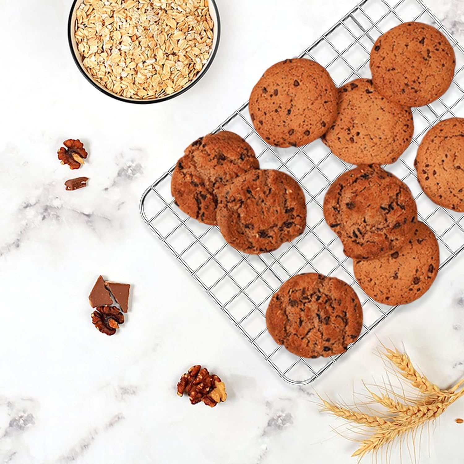 - EXQUISITE CRAFT: Made of thick gauge metal resistant to high temperatures up to 450°F, It is not easy to warp when used in the oven, The flat bottom design makes the cake evenly heated, Grid wire rack has 4 raised legs to raise food from pans or countertop for increased air circulation and cook evenly, Tight grid spacing prevents small items from falling out