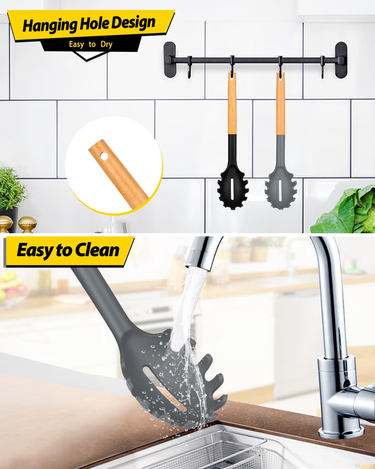 Pack of 2 Spaghetti Spoon, Silicone Pasta Fork with Wooden Handle, Heat Resistant Noodle Spoon Server, BPA Free Spaghetti Strainer(BLACK-GRAY)